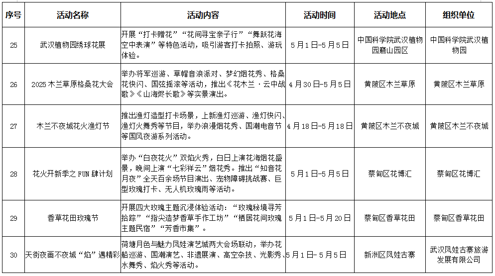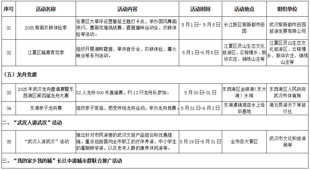 “烟火武汉 遇见知音”2025武汉长江旅游季时间跨度长,覆盖了五一、端午、六一等节假日以及“5·19中国旅游日”等主题日。参与范围广,跨省跨市跨区域。其间还将推出武汉十大品牌线路,发布系列宣传视频、假日打卡攻略、线路产品手册、景区惠民政策,市民游客可以通过武汉文旅官微、官博等平台,了解更多详情,拟订出游计划。市文旅局还将组建多个督导组,联合各区各部门制定假日安全工作方案和应急预案,加强文旅场所隐患排查整改,确保各项活动精彩、有序、安全。