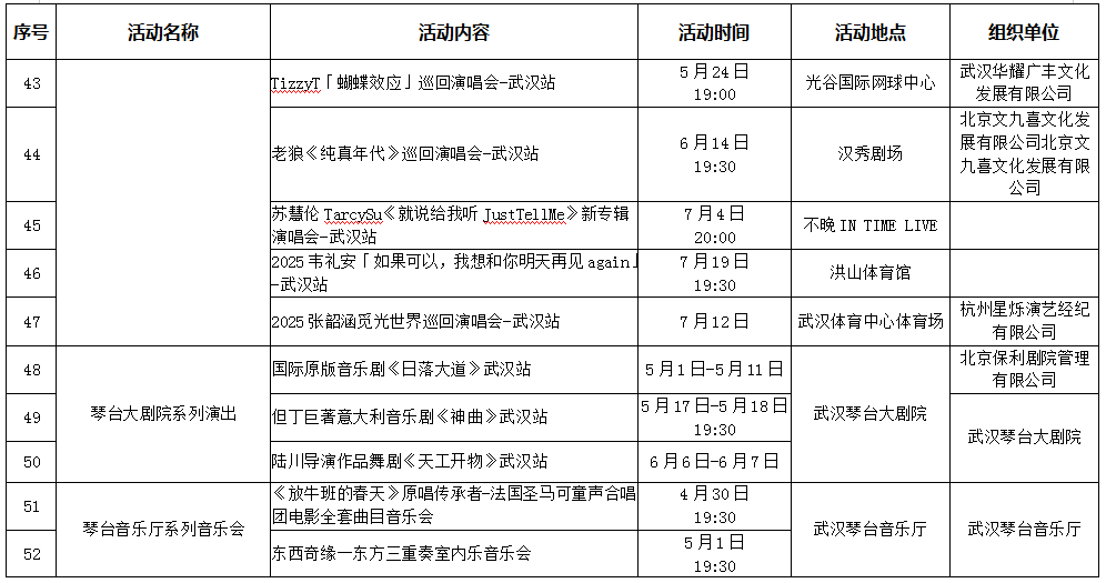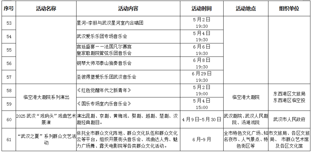 武汉是知音故里,高山流水遇知音。“遇知音”演艺系列活动丰富多彩。有太空奇缘音乐节、汽水音乐节,有张韶涵、毛不易、老狼等艺人专场演唱会,还有武汉“戏码头”戏曲艺术展演、武汉之夏文艺汇演、文艺院团进景区等,音乐无处不在,遇见无处不在。