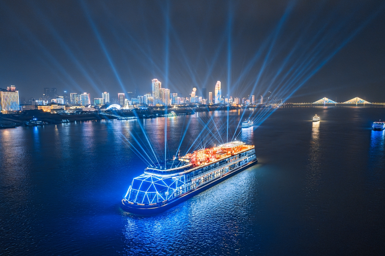 长江游船梦幻联动长江灯光秀,举办日落音乐派对、欢乐蹦迪等活动。