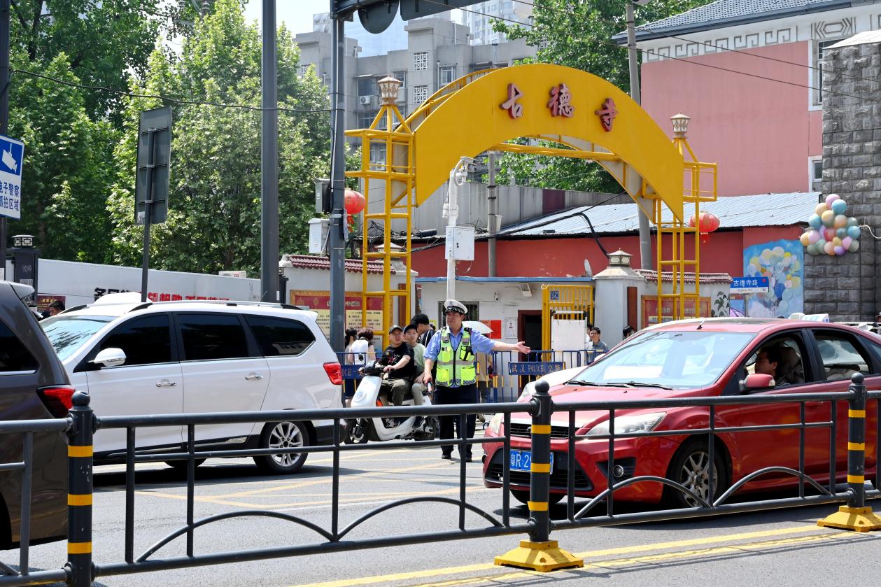在工农兵路古德寺入口处,交警正在指挥车辆有序通行,新村所民警和工作人员正在引导人流有序排队入寺。