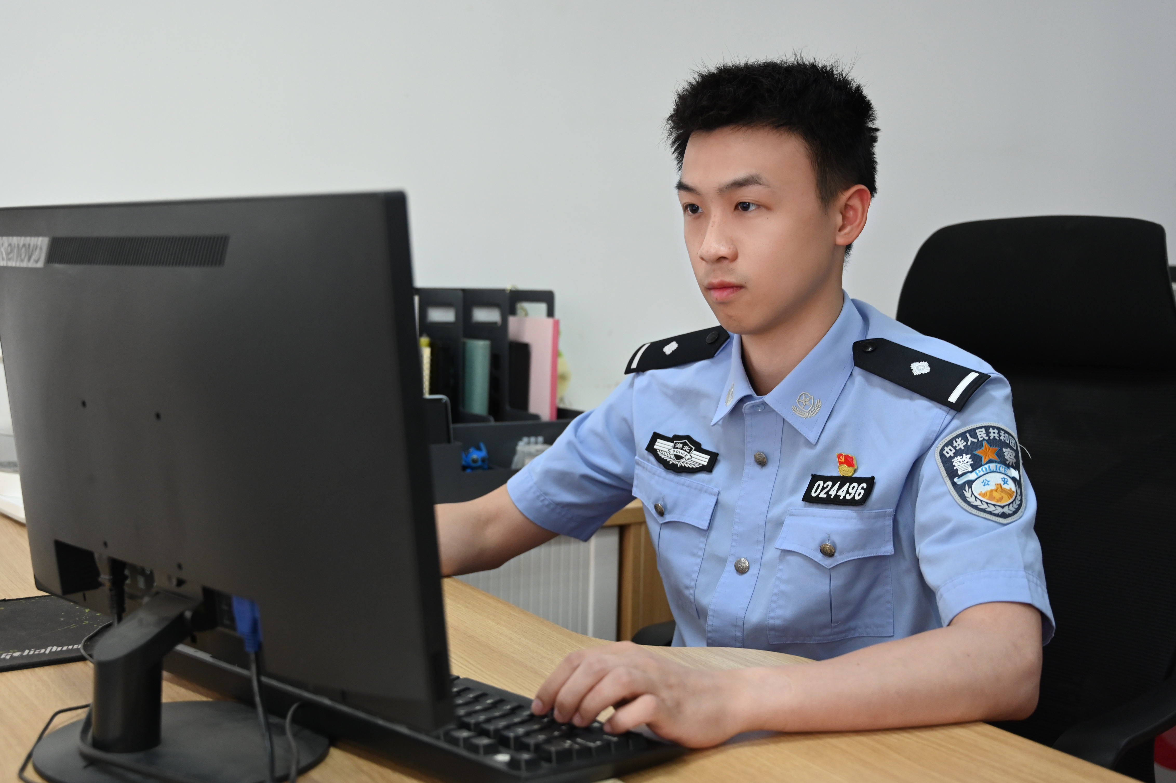 李昊今年25岁。2023年7月,为追寻儿时的警察梦,他考入武汉市公安局江岸分局,成为花桥街派出所一名治安民警,并在一年多的时间里收到了一面墙的锦旗。
