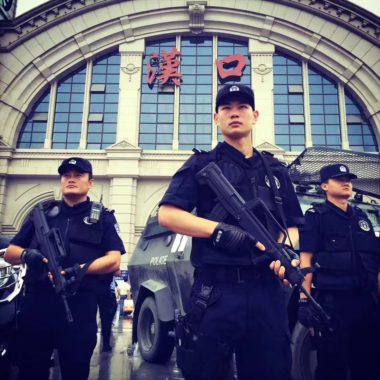 幸鑫(前)在汉口火车站前执勤。通讯员苏畅 摄