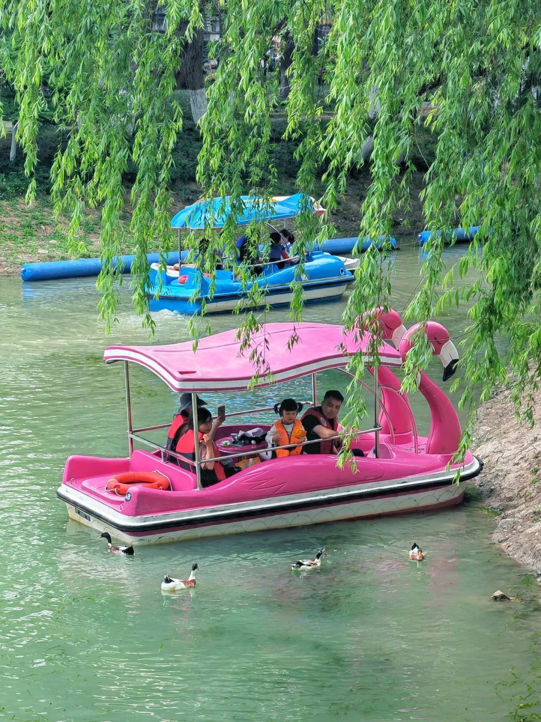 初夏的解放公园,碧波荡漾,垂柳轻拂,一家人乘着火烈鸟造型的游船,笑语盈盈。父母温柔陪伴,孩子眉眼弯弯。水中鸭子欢快游弋,似在为这份美好伴舞。阳光洒落湖面,映照着他们幸福的模样。