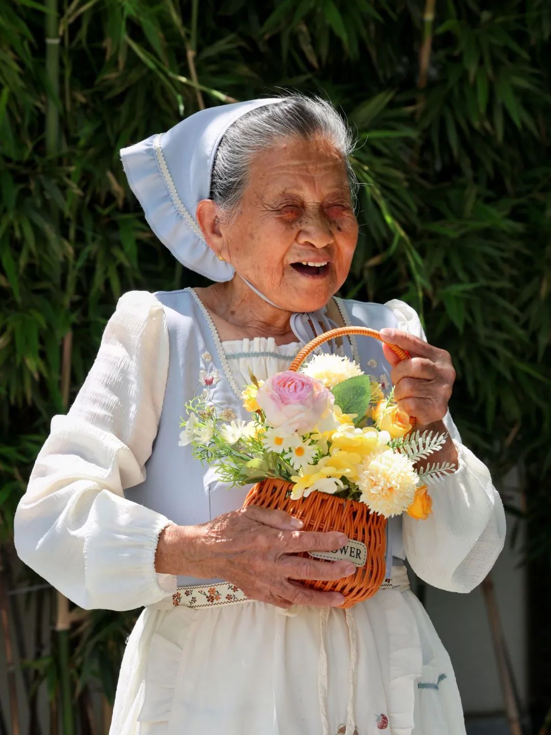 中午,我们在花园拍完参加活动的小朋友,正准备离开吃午饭。刚走到院门口,一位奶奶突然吸引了所有人的目光——她身穿一袭白色长裙,头戴浅蓝色头巾,手提花篮站在竹林前,笑得特别亲切,感觉时光都变得温柔了。游客们纷纷举起手机、相机拍摄,奶奶也超配合。看着奶奶眼角的笑纹,“岁月从不败美人”这句话在她身上具象化了。
