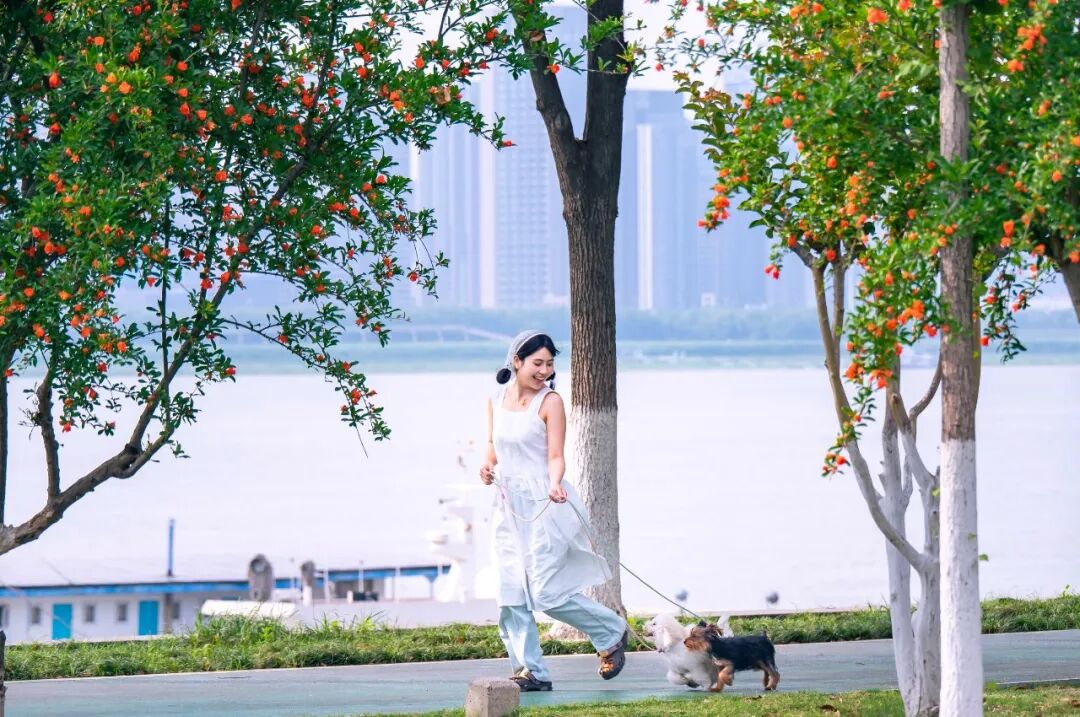 她步伐轻盈,脸上洋溢着愉悦的笑容。摄影于武昌江滩