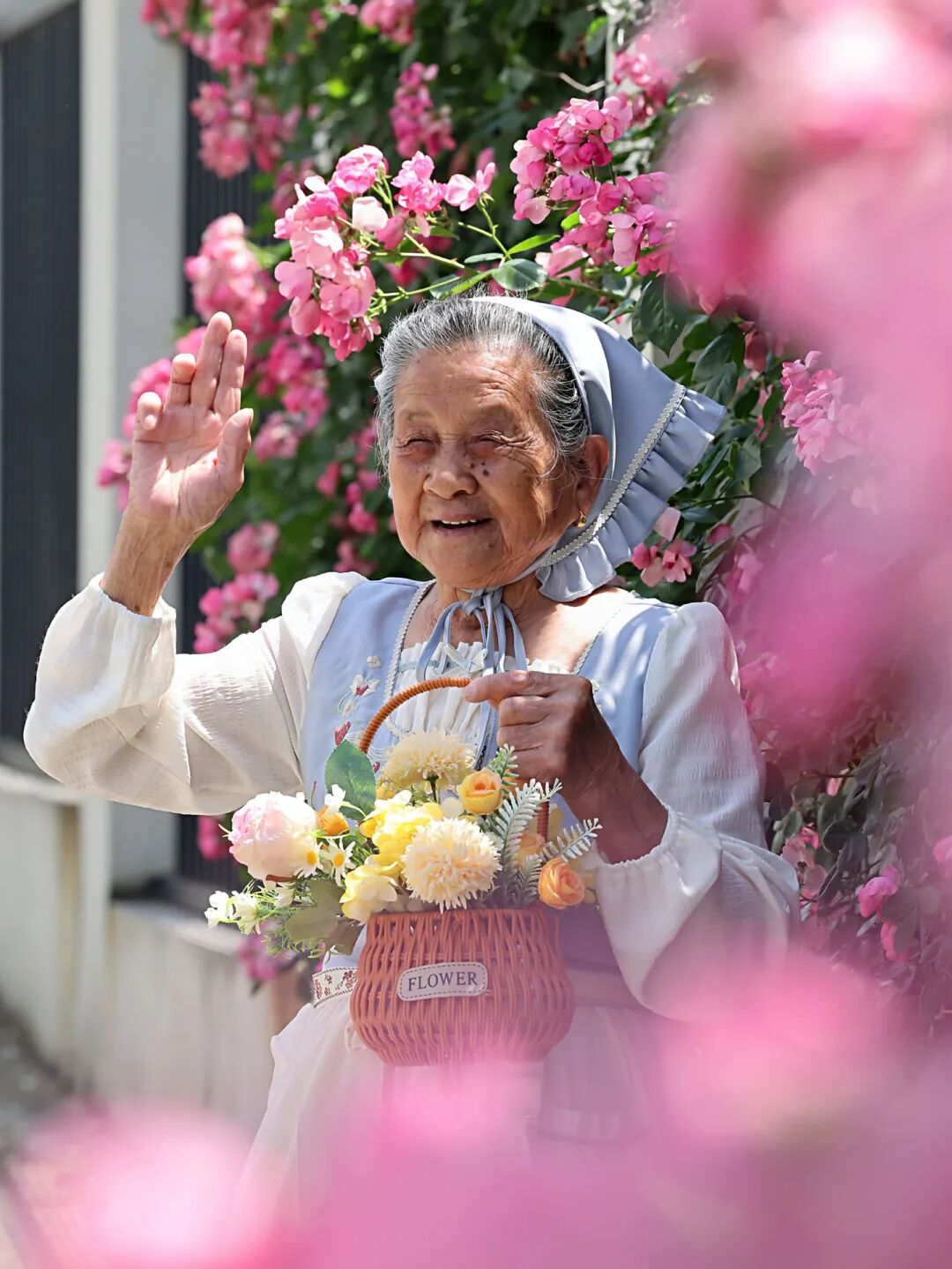 到了蔷薇花墙边,我们想让奶奶休息会儿,可她始终站着,不停变换姿势,还朝我们招手。快门声此起彼伏,奶奶始终慈祥地笑着,那镜头感一点都不输模特。拍摄间隙,奶奶的家人告诉我们,虽然奶奶都96岁了,但她每天都把自己打扮得漂漂亮亮的。我一边调整相机参数一边想,“奶奶这是在用行动告诉我们,快乐生活从来不需要理由。”