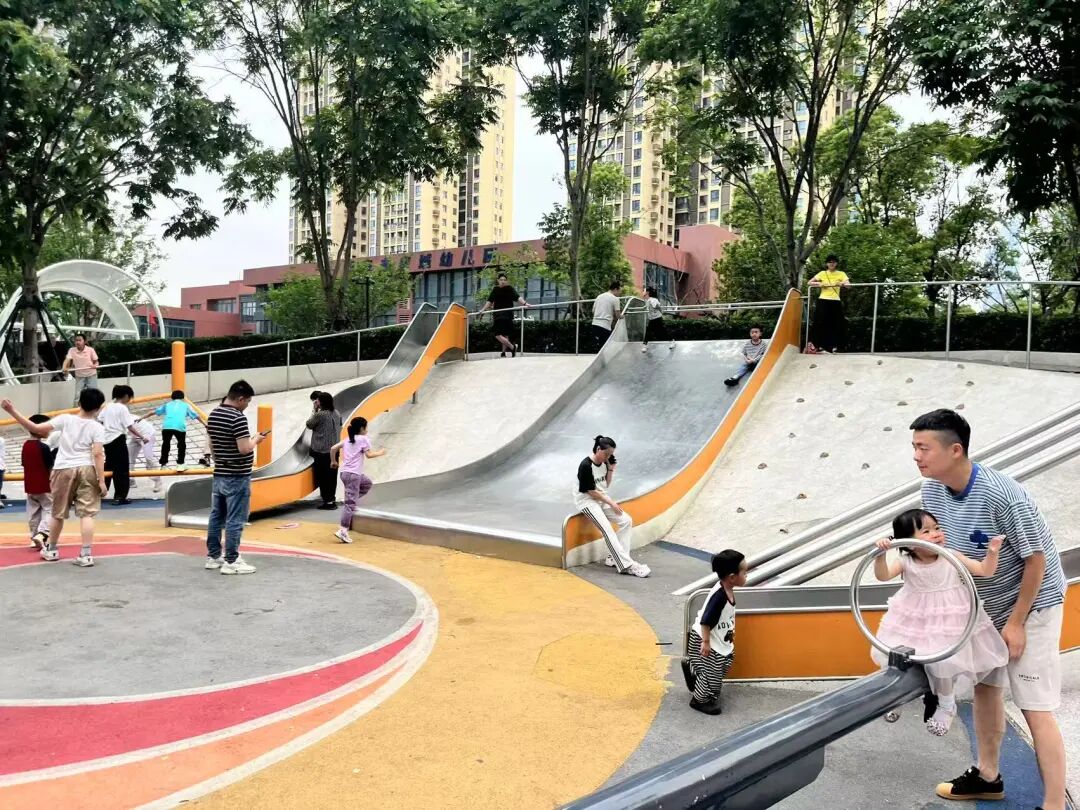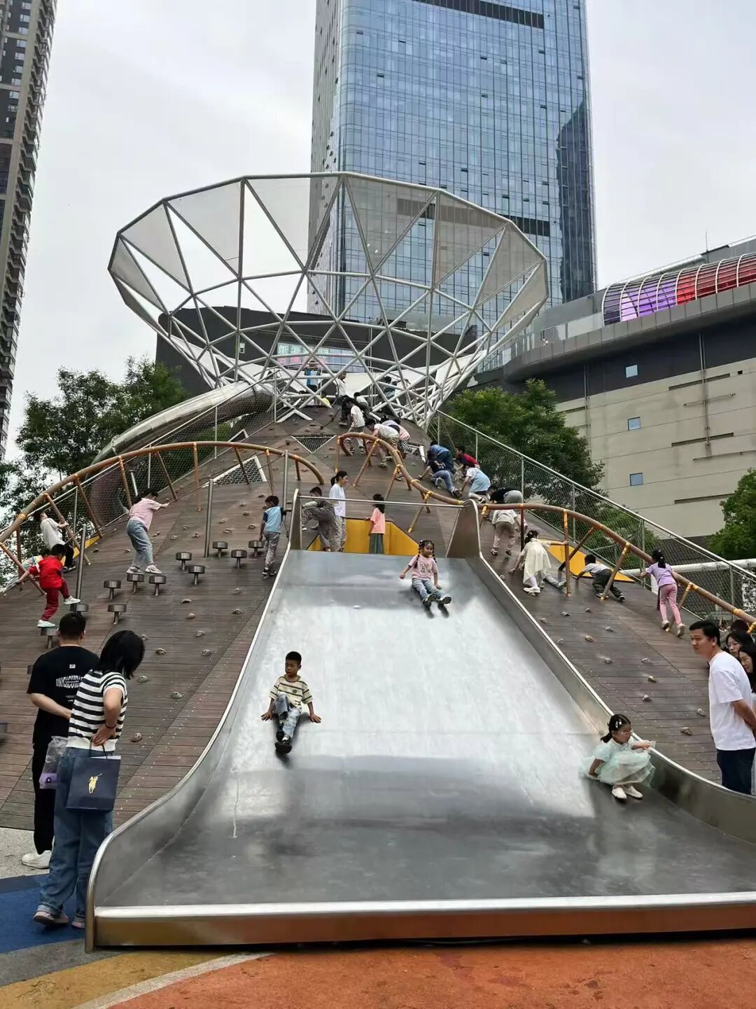 以万科未来中心VCF旁的虫洞公园为例,这原是我计划在游览武汉动物园后,用以消磨时光的一个口袋公园。然而,孩子一踏入其中,便仿佛回到了“快乐老家”,要玩到天黑才肯罢休。一眼望去,公园里秋千、攀爬架、滑滑梯、跷跷板等各类游乐设施应有尽有,既受稍大儿童的喜爱,也能够让成年人放松休闲。
