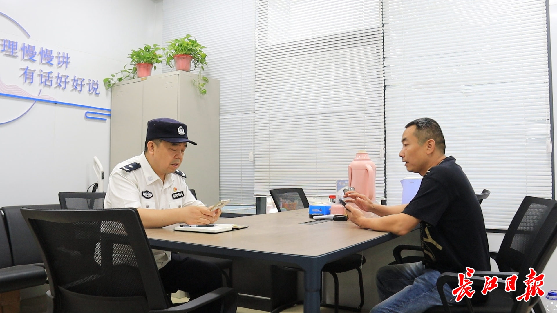 市民辛雷兵(右)在湘隆社区警务室里,和社区民警肖利军(左)在交谈。记者夏奕 摄