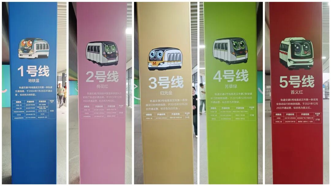 1号线是地铁蓝,2号线是梅花红,3号线是归元金,4号线是芳草绿……同时柱子上面还介绍了每条线路的特点、开通时间、开通范围、车站数及沿线站点推荐。比如2号线是中国首条穿越长江的地下轨道交通线路,5号线是武汉市第一条采用全自动运行的地铁线路……