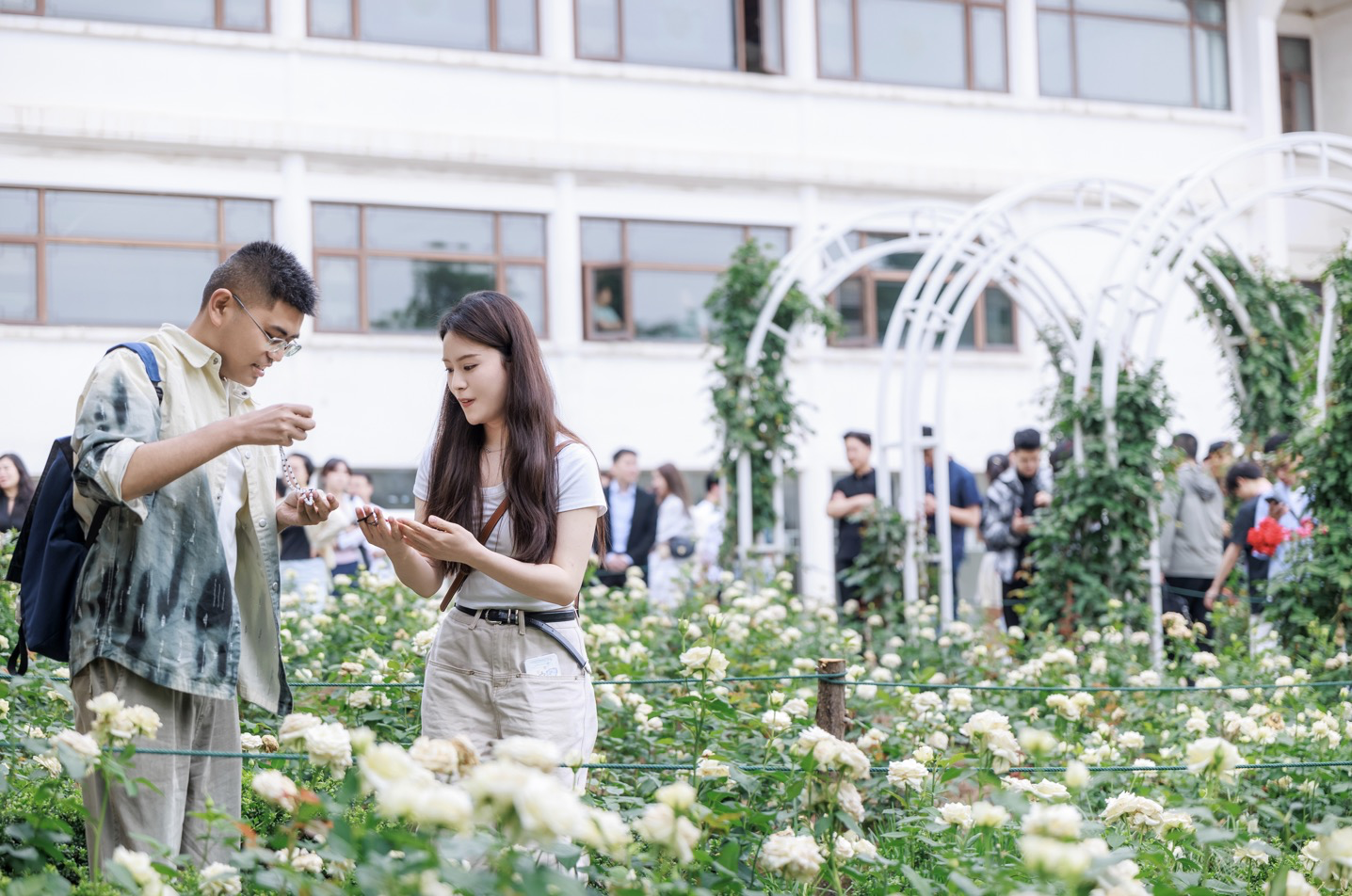 活动尾声,嘉宾携手走进落雁玫瑰园,穿梭于西式玫瑰花亭与中式玫瑰长廊之间,探寻“天地良缘”。3万余株玫瑰竞相绽放,枝蔓缠绕花架,香气馥郁,宛如步入爱情殿堂。不少参与者纷纷拍照留念,记录下这一段难忘的邂逅时光。