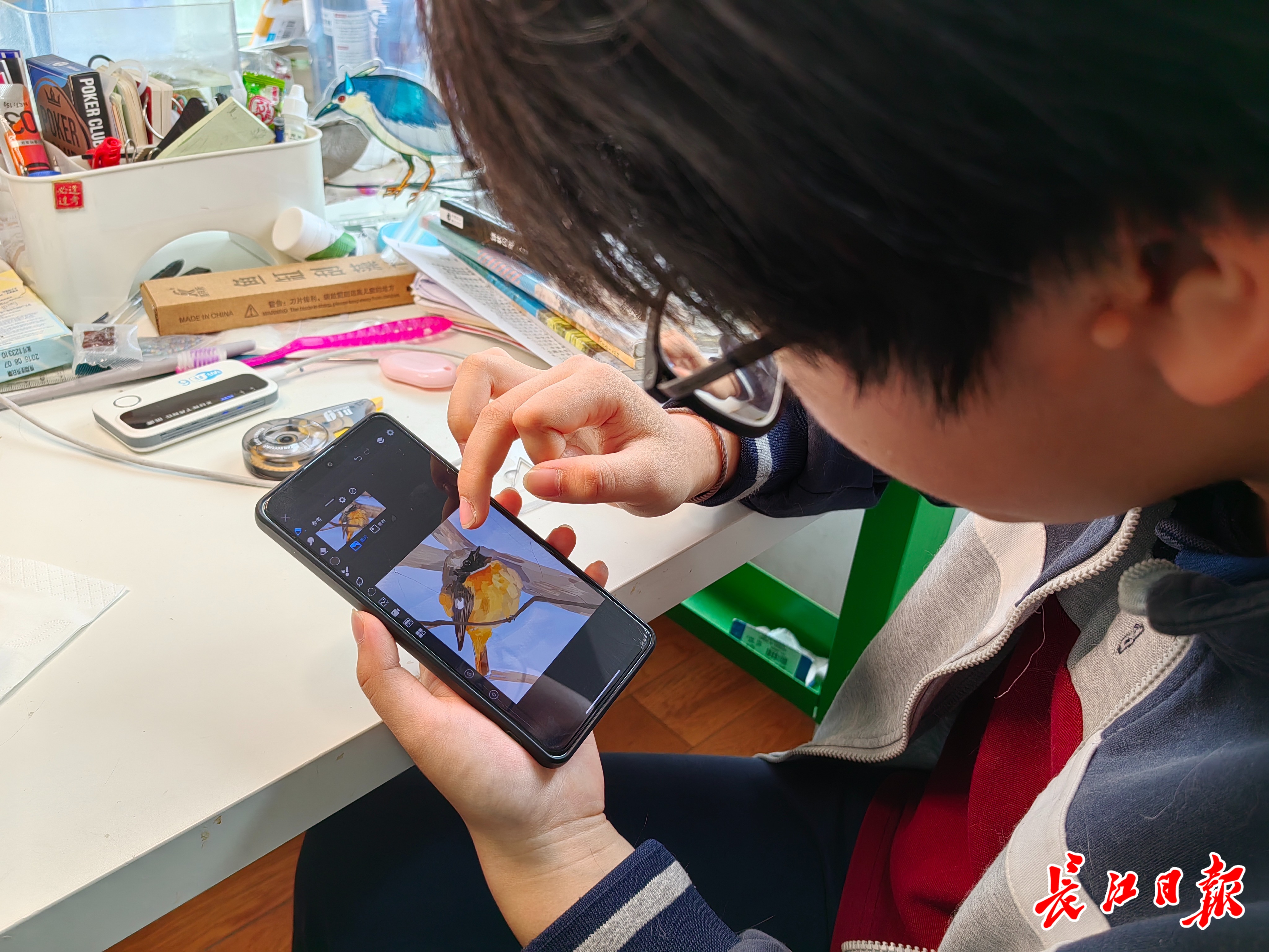 夏羚窈用手机画鸟。记者金文兵 摄