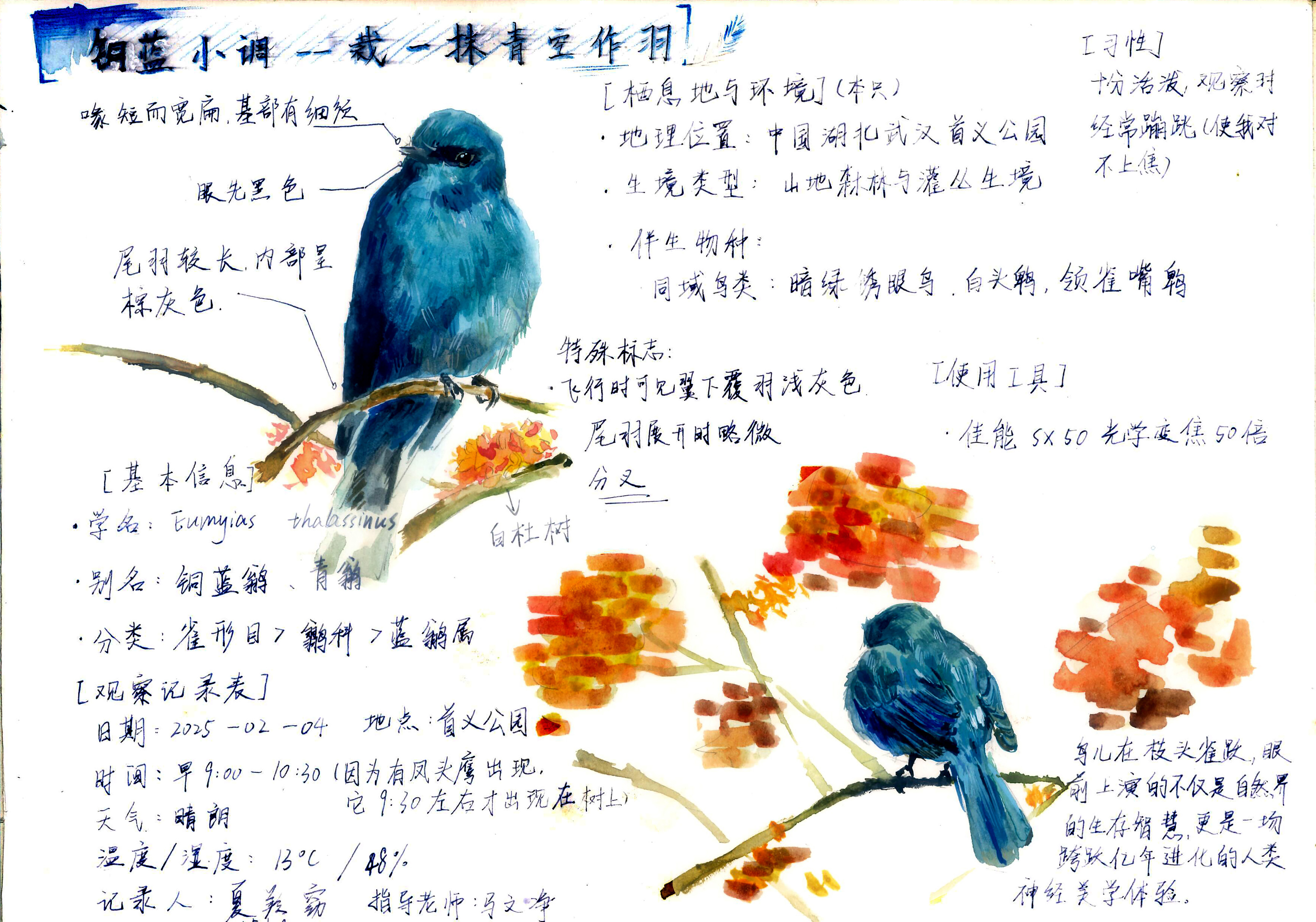 一种颜值很高的鸟儿铜蓝鹟,直到2019年3月才在武汉被首次记录到。夏羚窈很喜欢这种通体蓝绿色的鸟儿。今年2月,她终于在首义公园观察到这种鸟儿在树头雀跃,于是精心制作了观察记录,画下它的身姿。