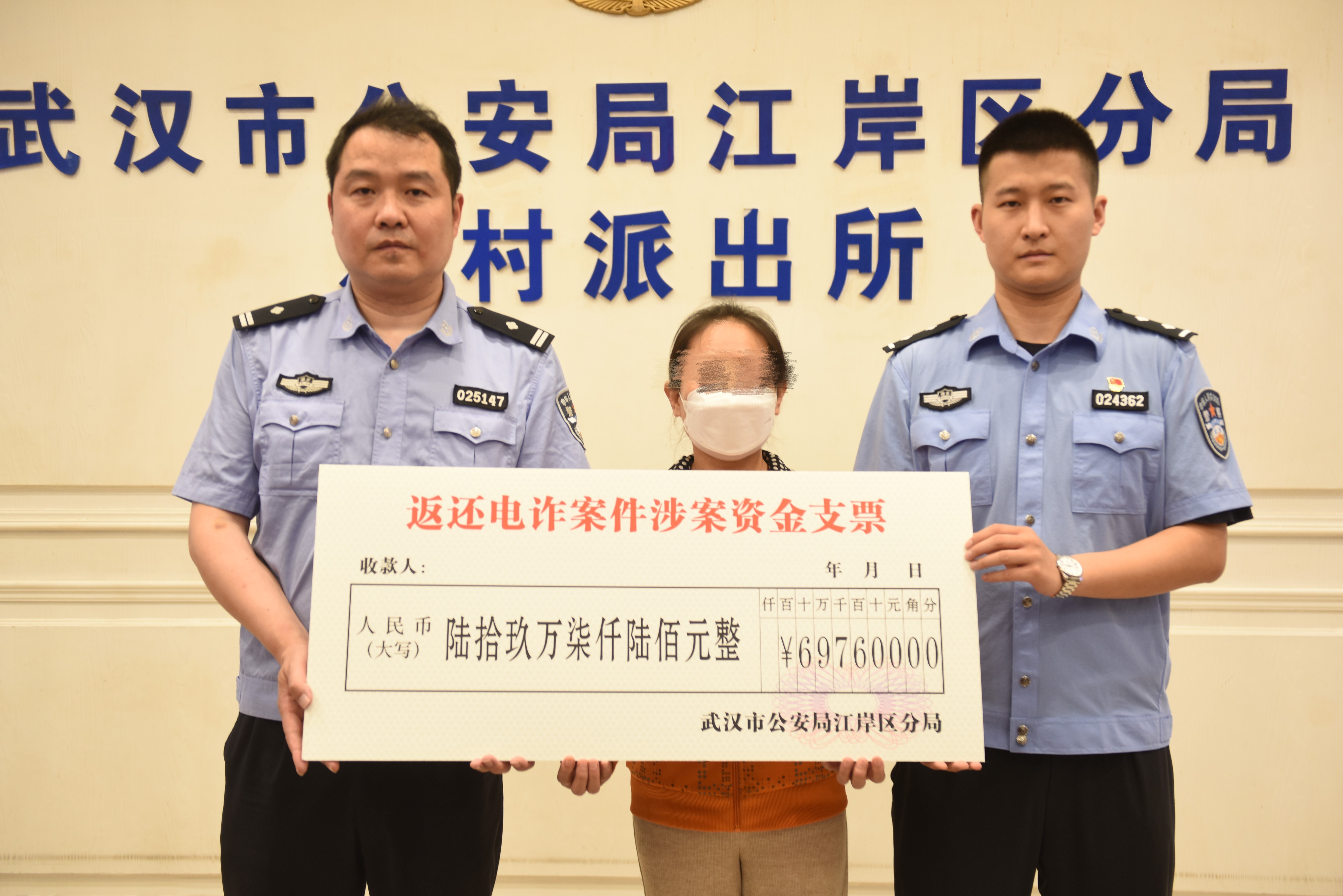 2025年5月15日,江岸警方在新村街派出所举行赃款发还仪式,郑女士从兰州赶来领回被骗的69.76万元。