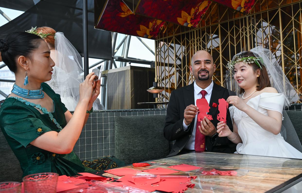 5月19日,11对来自中外的新人在重庆市渝中区来福士洲际酒店SHUA高空露台举办了“爱·‘渝’见‘中’情”520云端集体婚礼。婚礼上还进行了拓印、非遗剪纸等民俗展示。 新华社记者 陈诚 摄