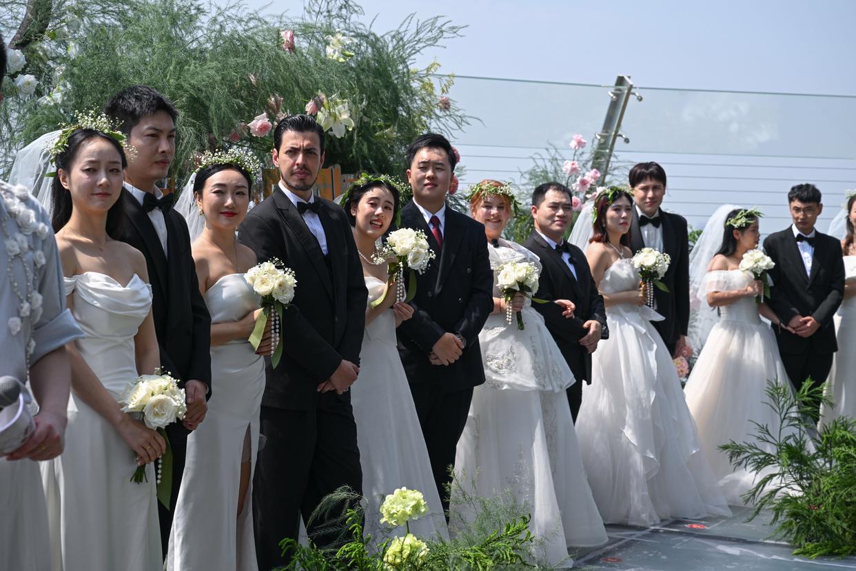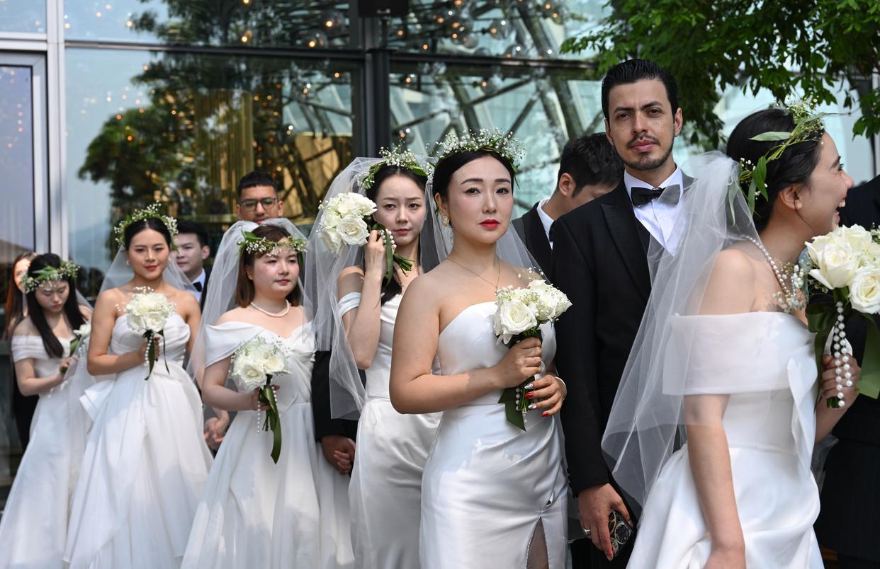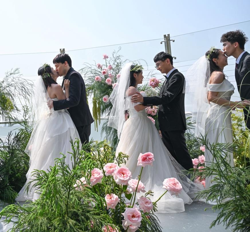 5月19日,新人在重庆来福士洲际酒店SHUA高空露台举办集体婚礼。新华社记者 陈诚 摄