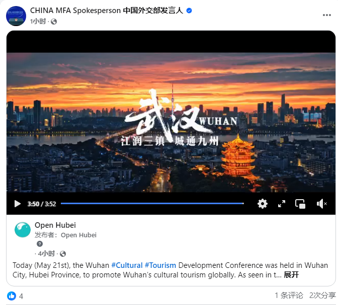 长江日报大武汉客户端5月21日讯(记者黄丽娟 通讯员武文旅)武汉又火到国外!5月21日,外交部发言人海外账号在X和Facebook两大平台上转发推送武汉年度宣传大片《武汉,江润三镇 城通九州》,并写道——今日(5月21日),武汉文化旅游发展大会在湖北省武汉市召开,旨在向全球推广武汉的文化旅游。如视频中所示,武汉是一座与水紧密相连的城市。