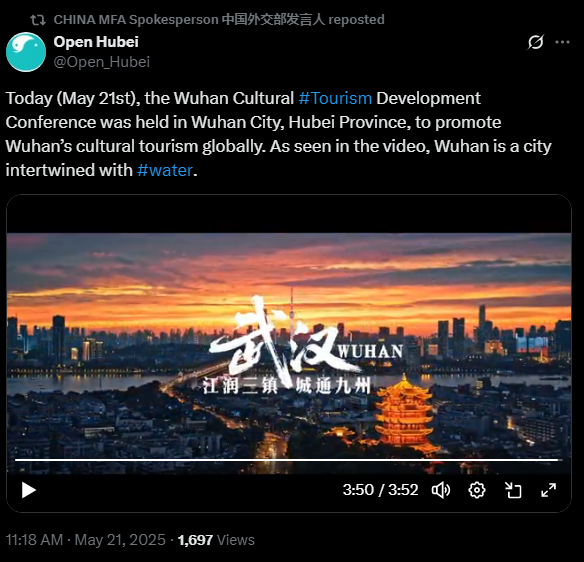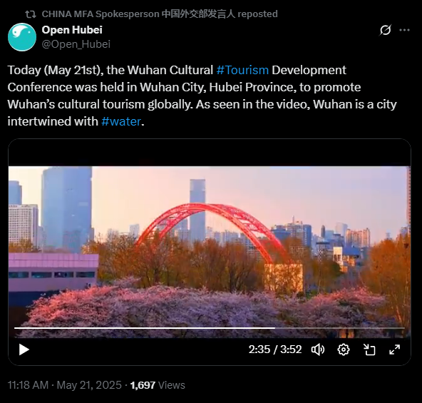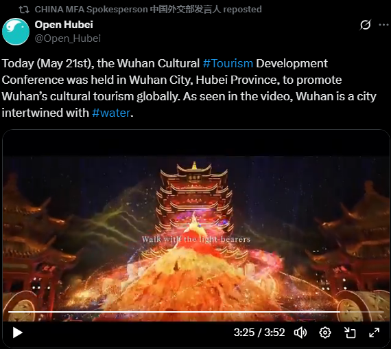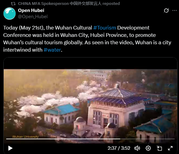 5月21日,外交部发言人海外账号在在X和Facebook两大平台上转发推送武汉年度宣传大片《武汉,江润三镇 城通九州》截图。