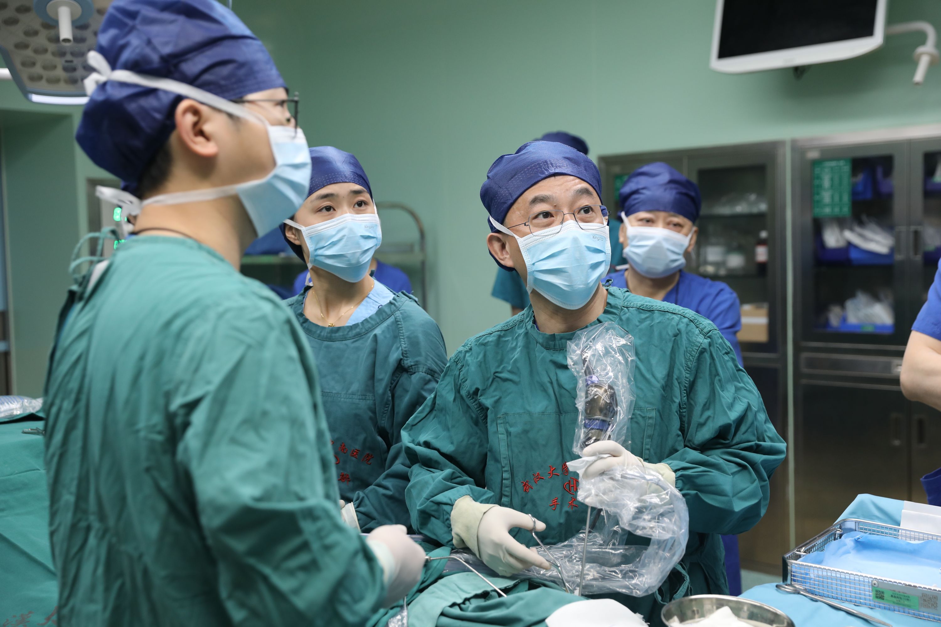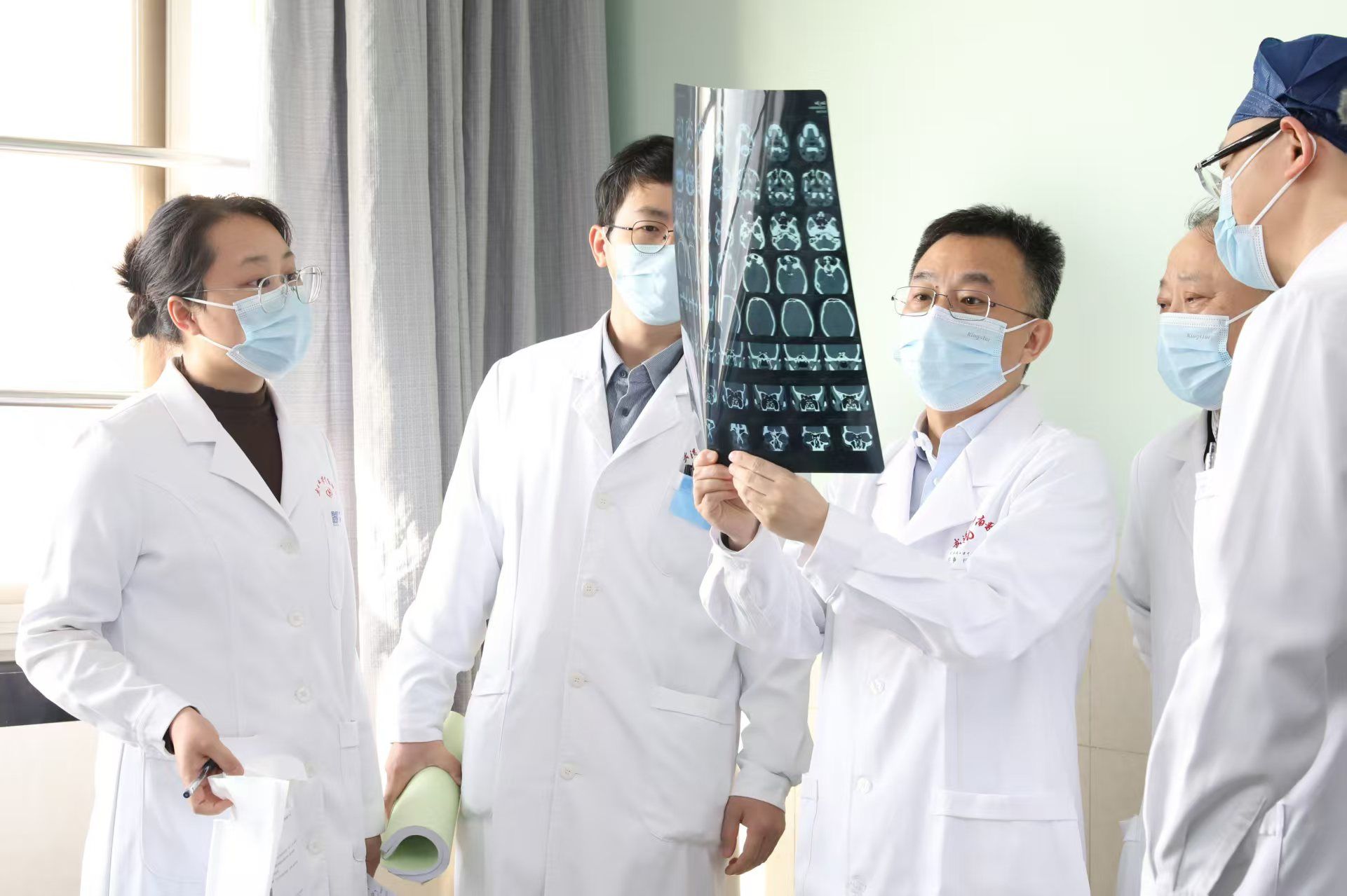 刘争(右一)带领团队为慢性鼻窦炎患者实施精准治疗。