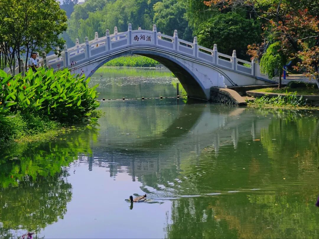 江汉区小南湖公园,湖水潋滟。石桥横跨其上,小鸭自在游弋。绿树环绕,绘就一幅满溢诗意的湖景图。