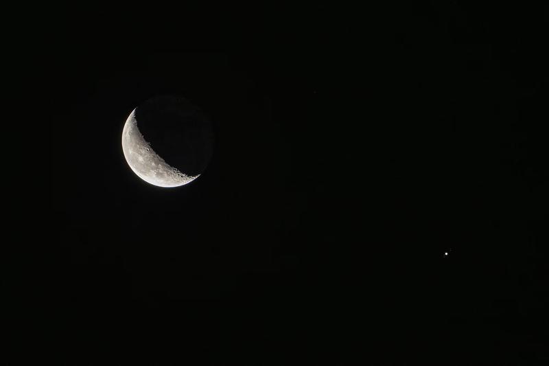 28日,月球会来到傍晚的低空,当日正逢农历五月初二,日落后在西偏北的低空可以看到一弯极细的新月。在新月左下方不远处就是明亮的木星,亮度为-1.9等,虽然现在远不如其最亮时的-2.94等,但依然灿若宝石。在暮色的映衬下,两者看上去般配且登对,颇具观赏性,成为天边一道亮丽的风景线。