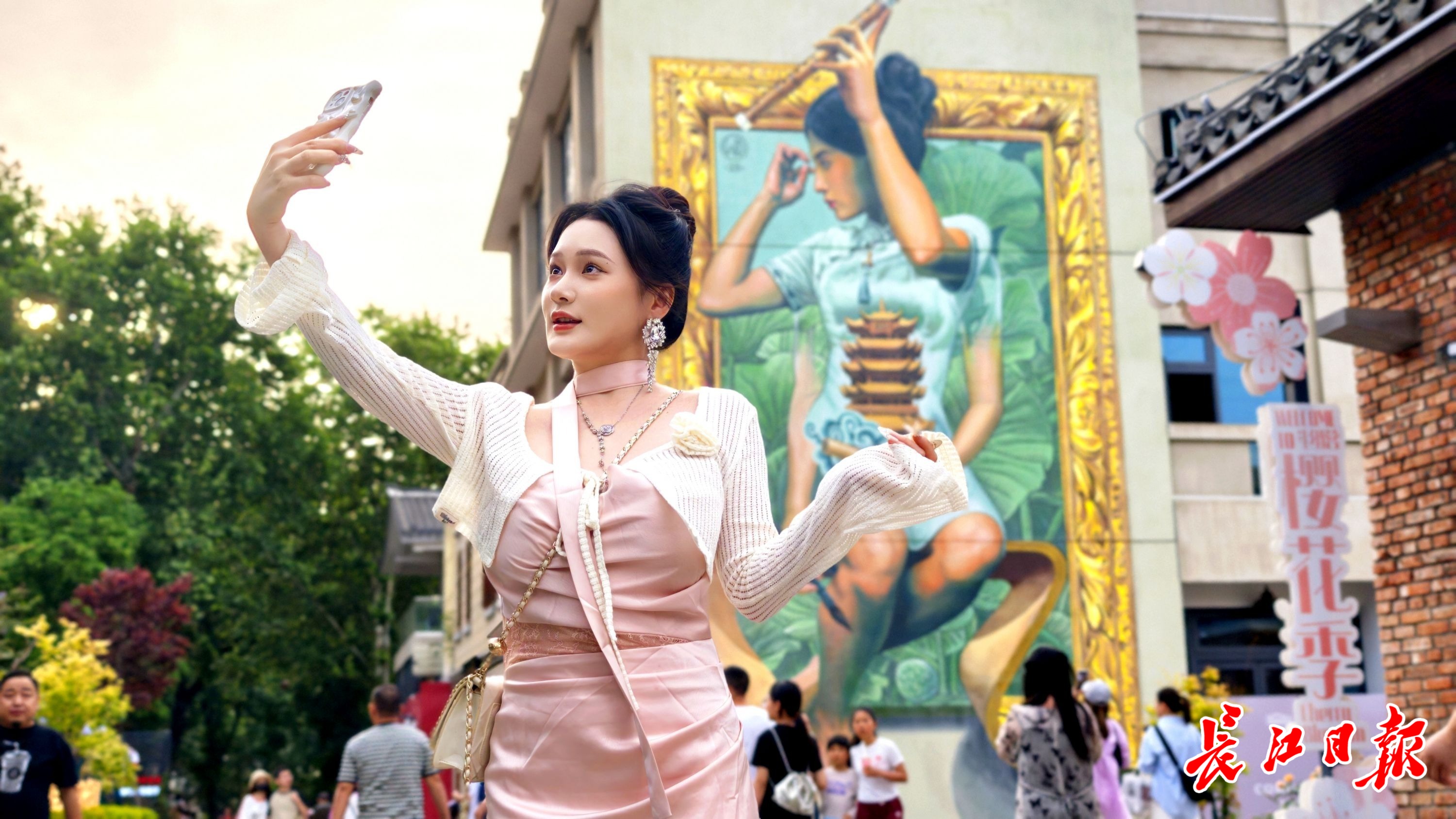 在武昌斗级营,众多游客纷纷以巨幅壁画《玉笛黄鹤》为背景合影。记者何晓刚 摄