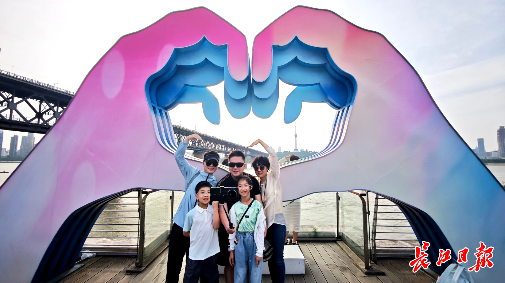 武汉长江大桥前,“比心”墙临江而立,吸引游客合影。记者何晓刚 摄
