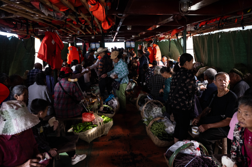 船票只要5到12元,比坐车便宜得多。对于沿江的村民来说,这不仅是交通,更是生计。他们带着自家种的菜、摘的水果、养的鸡鸭鹅乘船去县城赶早市,两个小时的航程是生活的一部分。船上没有豪华的座椅,却有着最鲜活的市井气息。