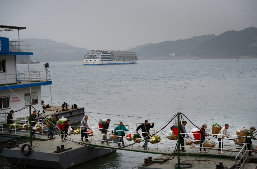 达忠县西山码,村民挑着各自的农产品有序下船。