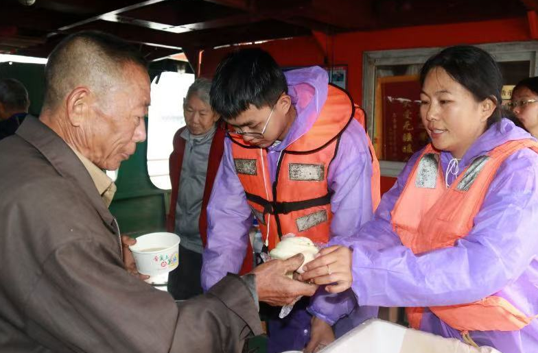 湖北姑娘曹利芳在为村民发放免费爱心早餐。