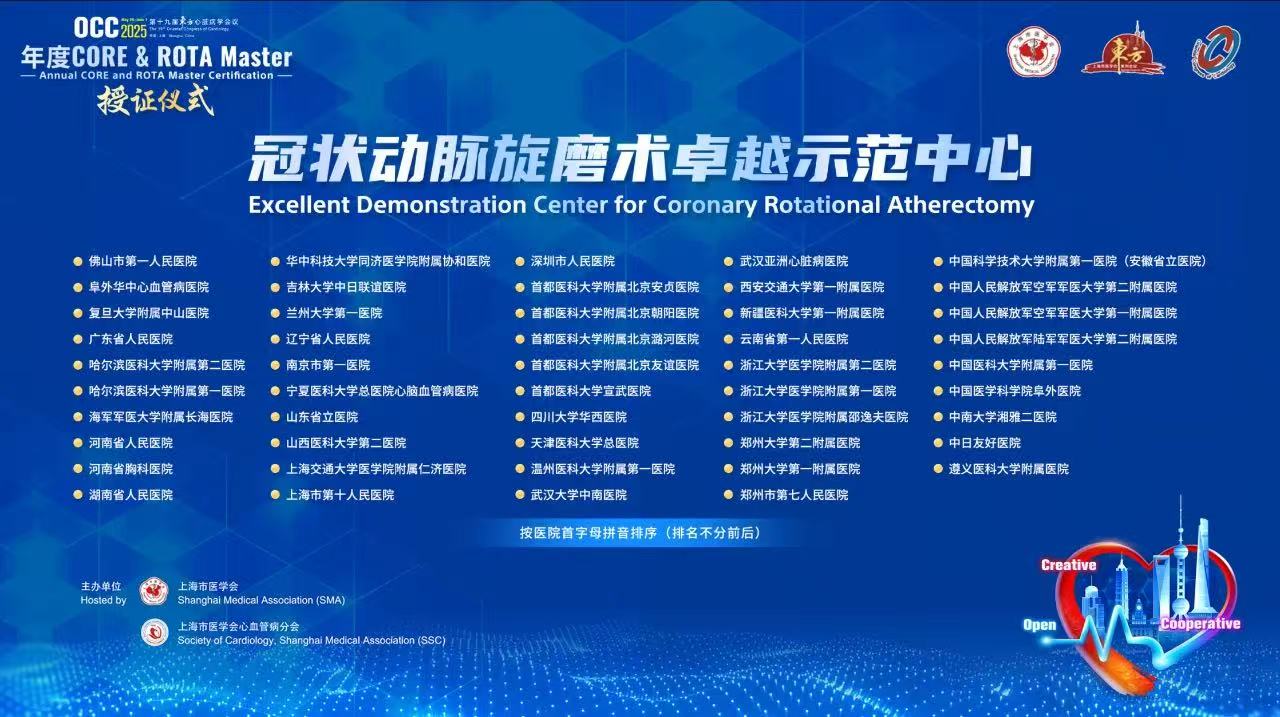 在国家放射与治疗临床医学研究中心的指导下,会议举行了“冠状动脉旋磨术卓越示范中心授牌仪式”及“旋磨大师ROTA Master授证仪式”,包括武汉大学中南医院心血管内科在内的全国49家临床医疗机构荣获“冠状动脉旋磨术卓越示范中心”称号,该院心血管内科副主任、冠心病介入诊疗中心主任胡笑容获颁“旋磨大师ROTA Master”证书,成为全国19位获此殊荣的专家之一。