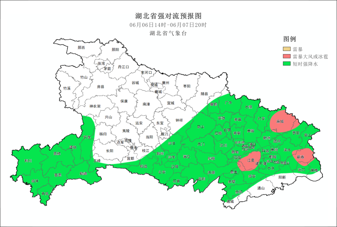 预计6日下午至7日,恩施、随州、荆门、荆州、天门、仙桃、潜江、武汉、孝感、咸宁、鄂州、黄石、黄冈将有短时强降水(最大小时雨强40~80毫米、局地90毫米以上)、局地8~11级雷暴大风和小冰雹等强对流天气,请注意防范。