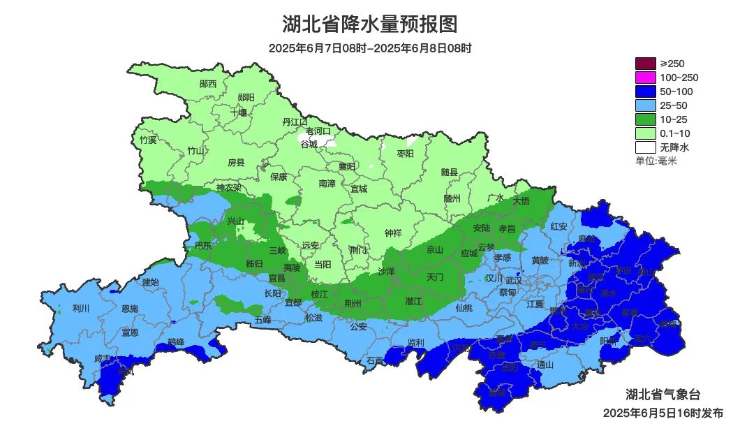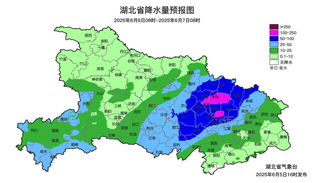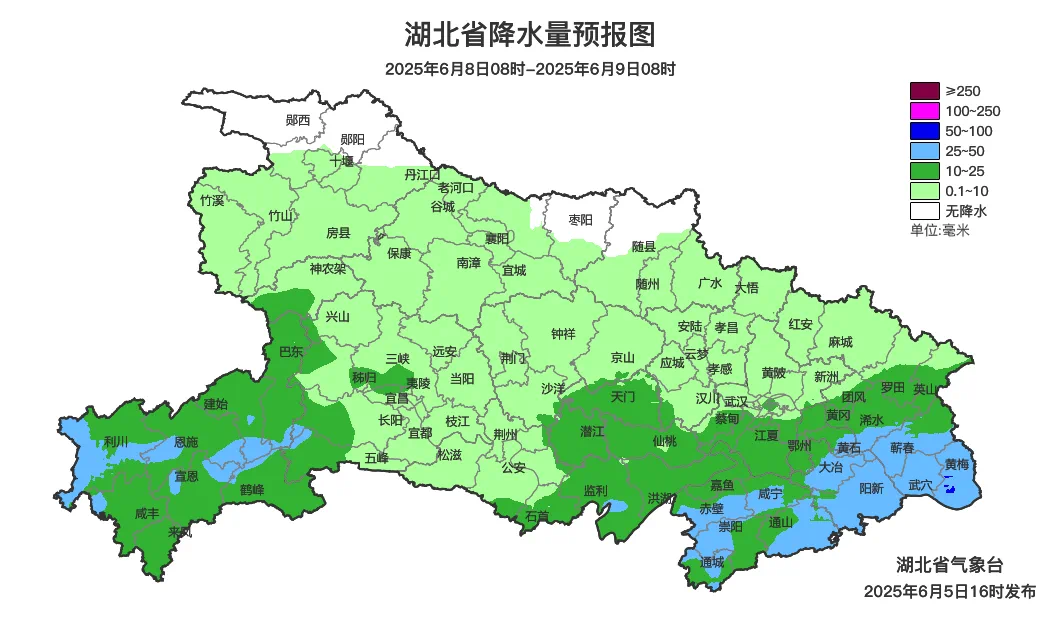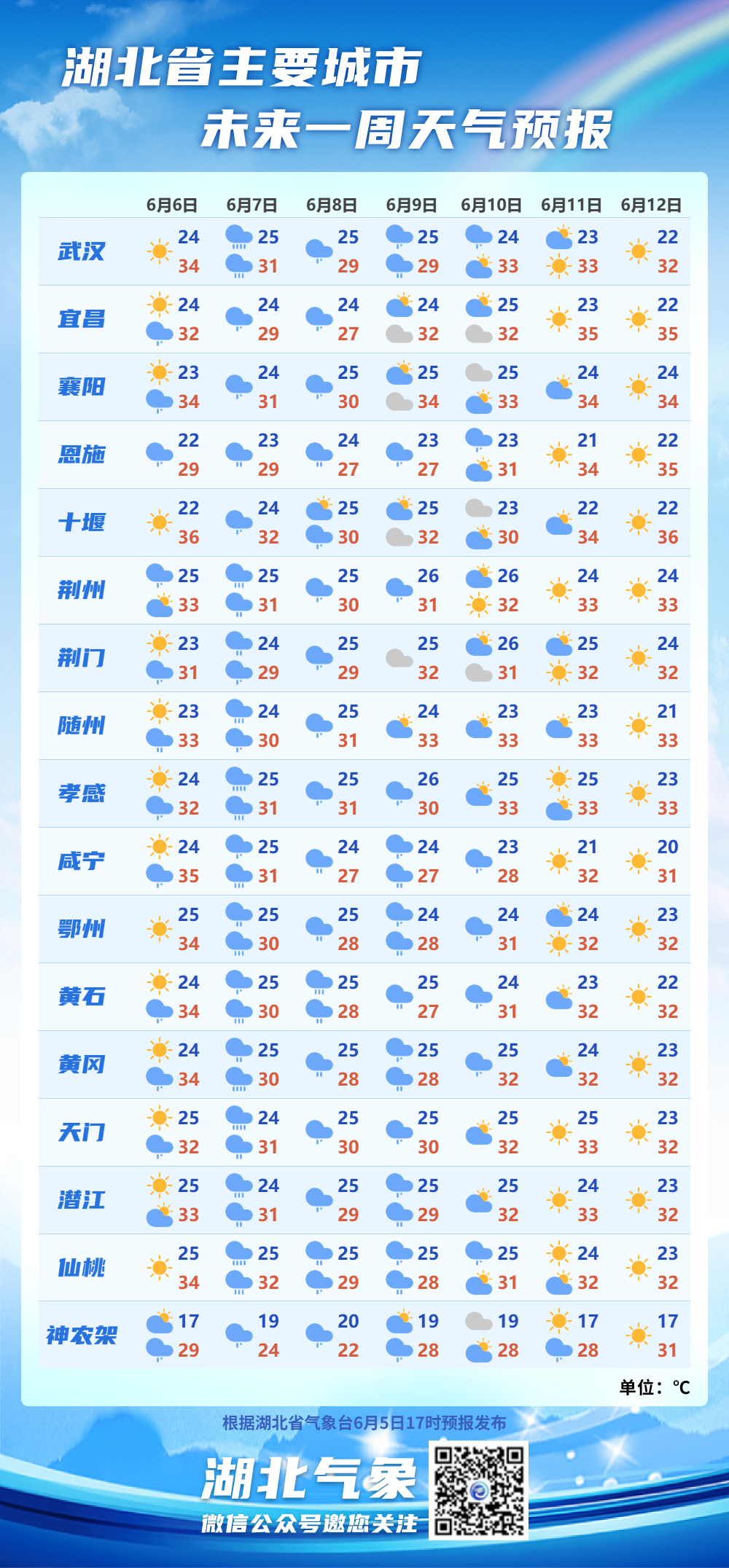 6月6日晚至6月9日,湖北降水持续在线,部分地区有大暴雨伴强对流天气,公众需关注预警预报信息,尽量避开强降雨时段出行。同时需加强防范强降雨可能引发的山洪地质灾害和农田渍涝等风险。