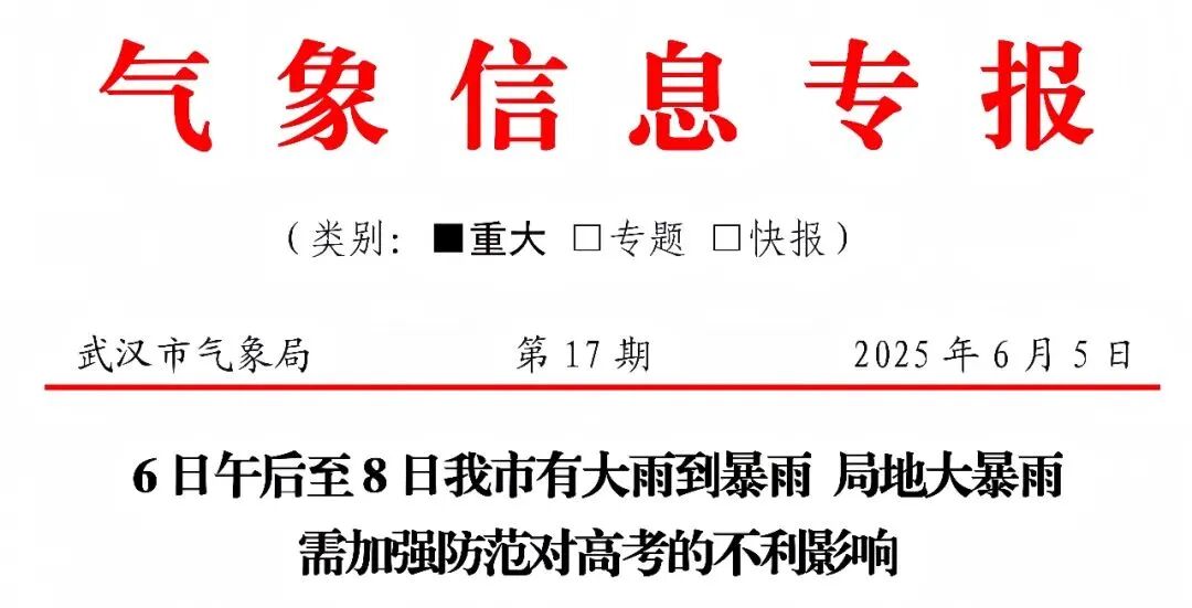 预计6日傍晚至9日鄂西南、江汉平原、鄂东地区有大雨到暴雨、局地大暴雨并伴有强对流天气。建议关注最新预报预警信息,合理安排出行时间,防范暴雨强对流天气对高考不利影响,鄂东南关注雷电对英语听力考试影响。