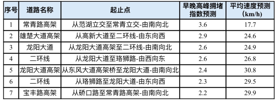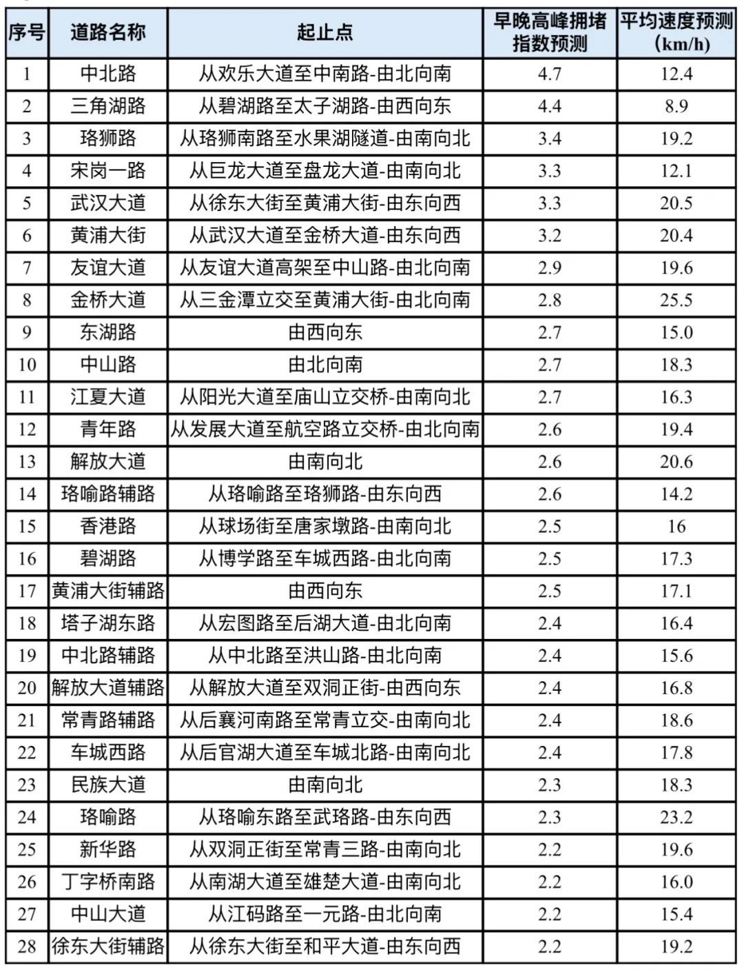 武汉交警预测6月9日早高峰各主干道上拥堵排名靠前的路段。