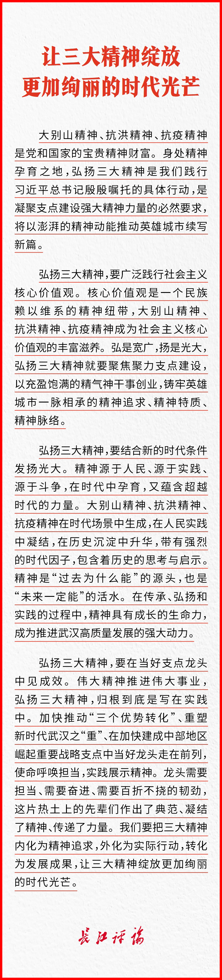 弘扬三大精神 奋力建成支点|弘扬三大精神,连发三论! ©原创 2025-06-09 18:48 0 去年11月, 习近平总书记考察湖北时强调, 大力弘扬大别山精神、 抗洪精神、抗疫精神, 广泛践行社会主义核心价值观。 弘扬三大精神,奋力建成支点 今年6月4日至6月6日, 长江日报连发三论。 ↓↓↓ 作者| 长江日报评论员 制图| 肖琴 编辑| 朱晨颖 校对| 余文婷