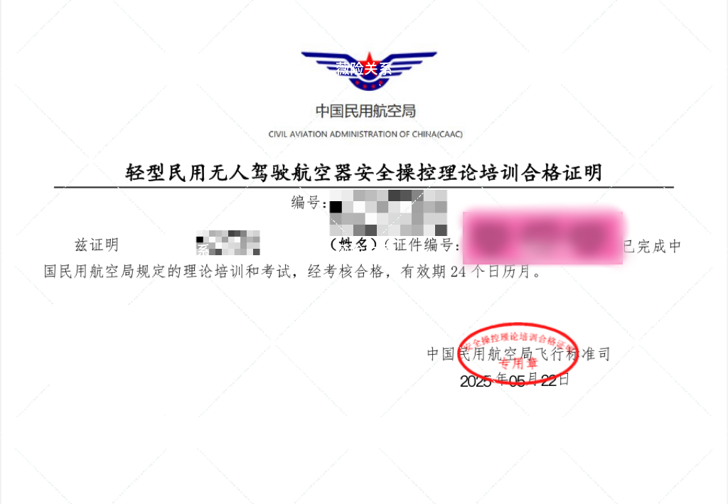 无人机安全操控理论培训合格证(全称《轻型民用无人机驾驶航空器安全操控理论培训合格证明》)是由中国民航局(CAAC)颁发的官方资质证明,是合法操控轻型无人机在管制空域飞行的必备文件,通过登录民用无人驾驶航空器综合管理平台,参加线上考试合格后,即取得电子证书。如需在管制空域操控轻型民用无人驾驶航空器,应当先考取安全操控理论培训合格证;如在适飞空域操控轻型民用无人驾驶航空器,则不需要。