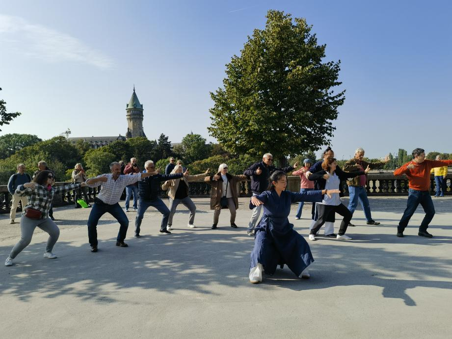 在卢森堡地标性广场,外国游客跟着武当太极传承人一招一式练习中国功夫。记者张萌 摄