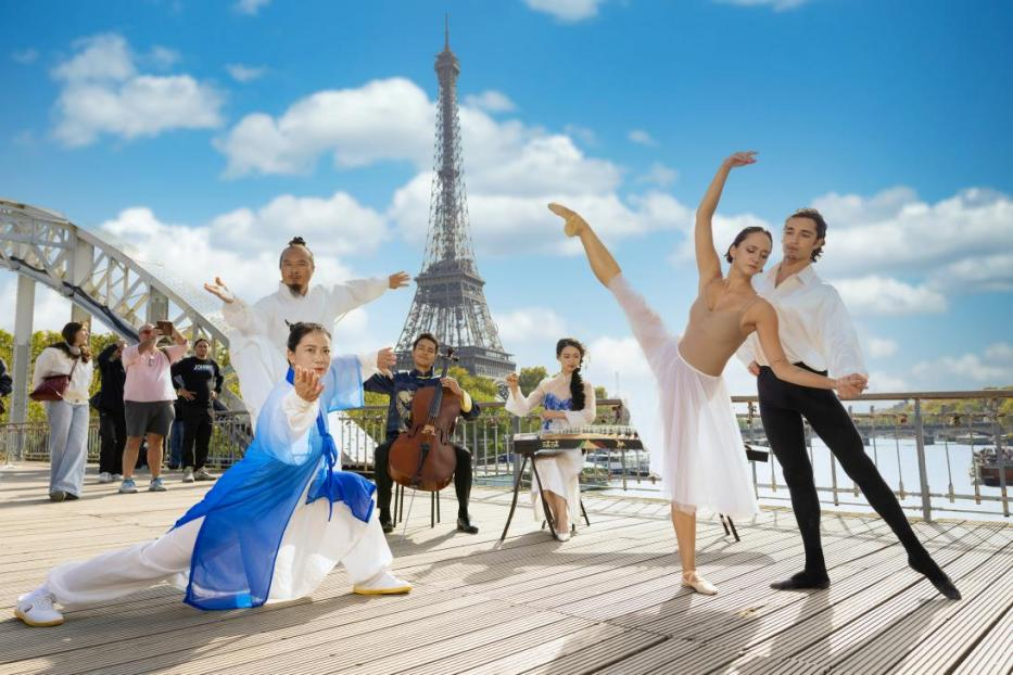 “长江遇见塞纳河”快闪现场,中外青年艺术家携手竞秀巴黎塞纳河畔。记者贾代腾飞 摄