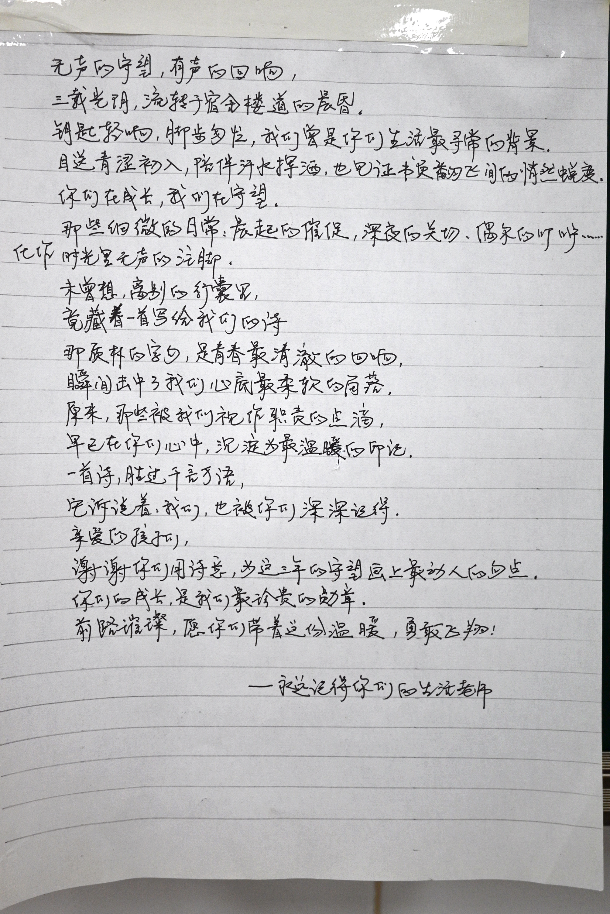 写诗的想法,谢益彰已经计划了很久。虽然是物理方向的考生,但谢益彰对文字的掌握十分细腻。思绪回到三年前。高一第一次住校,从没离开过父母的15岁男孩开始学习独自生活,好在宿舍楼配备了4名宿管阿姨。谢益彰说:“第一次看见阿姨,她们都很和蔼,像妈妈一样。”
