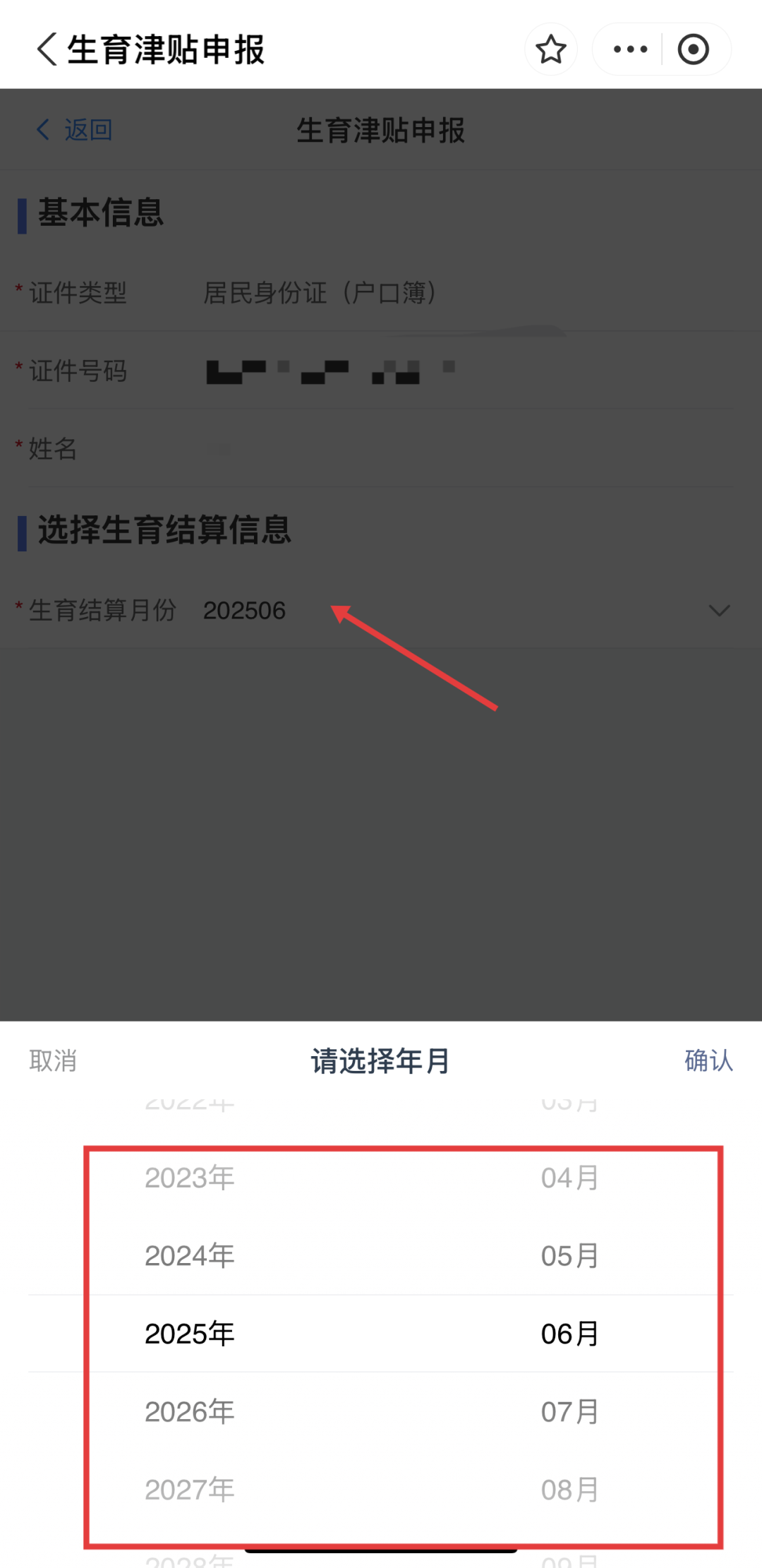 ④系统展示生育结算信息,请核对身份信息无误后,选择“生育结算月份”;