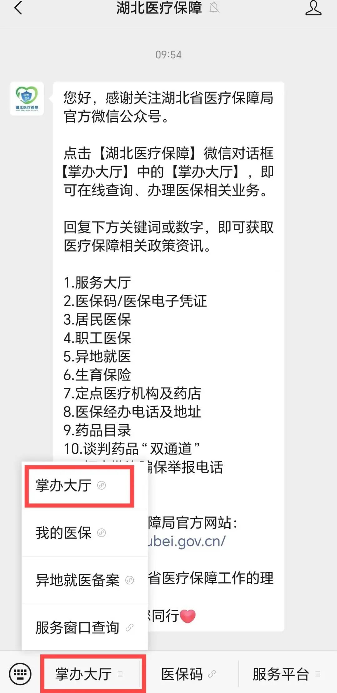 ①打开“湖北医疗保障”公众号对话框,点击【掌办大厅】,进入小程序首页;