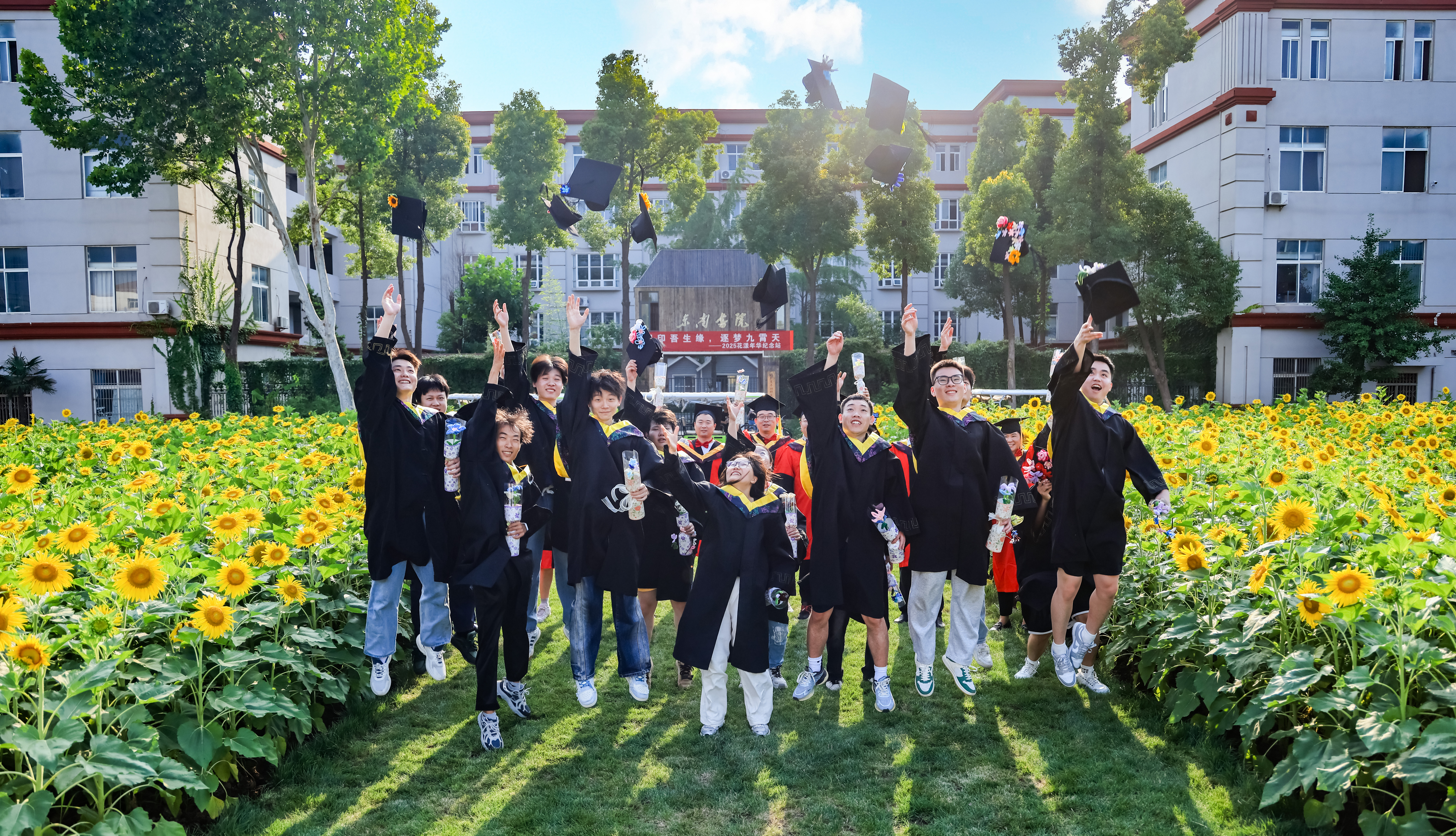 在主展区花漾年华纪念站,金黄的向日葵与缤纷夏菊交相辉映,学生们漫步其间,有的俯身轻嗅,用相机定格毕业照;有的站在葵花丛中将毕业帽抛向蓝天,绽放灿烂笑颜,花香与青春的气息在校园里久久萦绕。