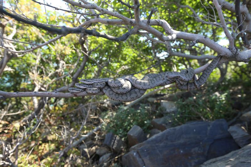 登上蛇岛,有一条木栈道蜿蜒而上,栈道两旁的树木枝繁叶茂,静静趴在树枝上的蝮蛇随处可见,灰色的外表与树枝几乎融为一体。“这是在守株待‘鸟’。”辽宁蛇岛老铁山国家级自然保护区管理局副局长王小平说,当小鸟落在枝头歇脚时,蝮蛇便伺机而动,一口咬住小鸟,并将其吞入腹中。
