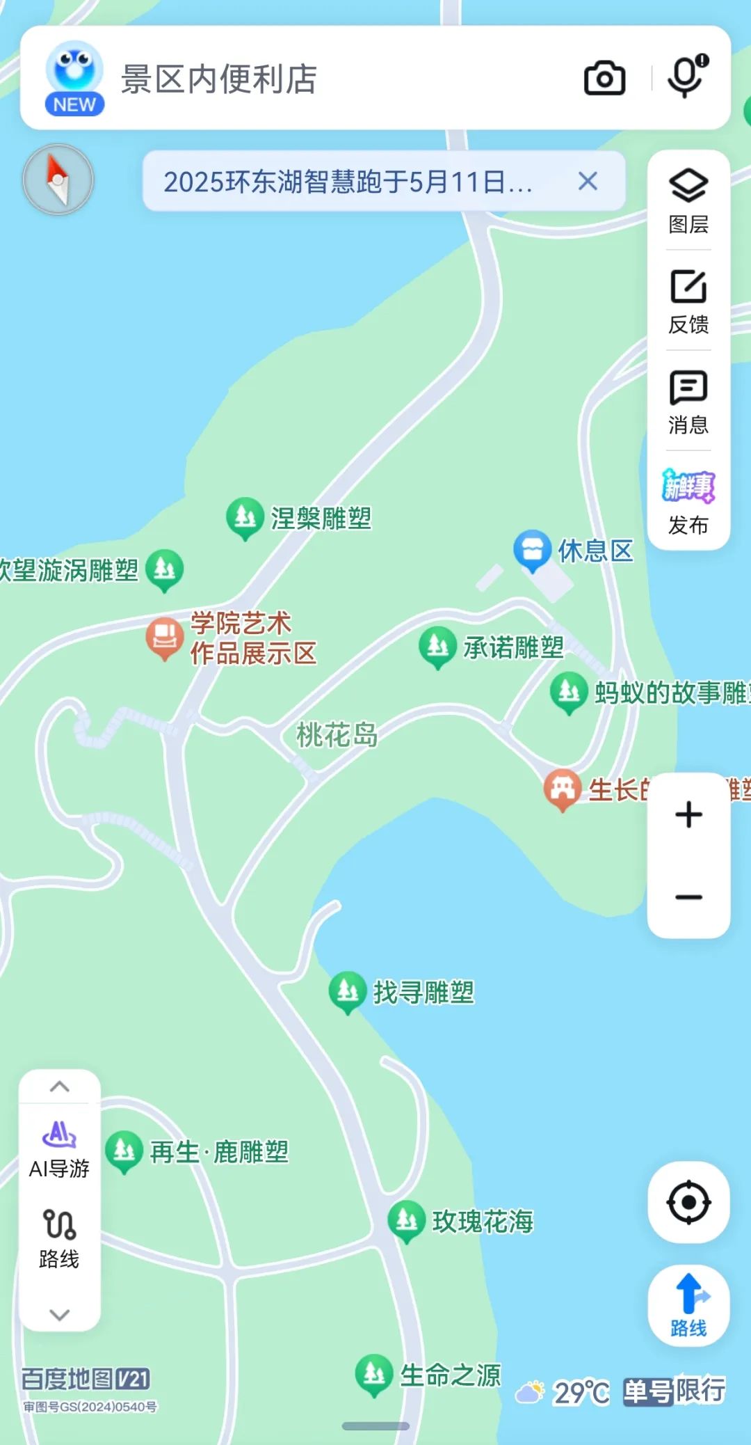 “承诺”“再生鹿”“朱雀”都是啥?你知道吗?我好奇地上网一查,发现东湖桃花岛有个国际公共艺术园,汇集了来自中国、荷兰、法国等多个国家的17位知名艺术家的雕塑作品,而且在地图上也能清晰地看到它们,这瞬间点燃了我的探索欲!