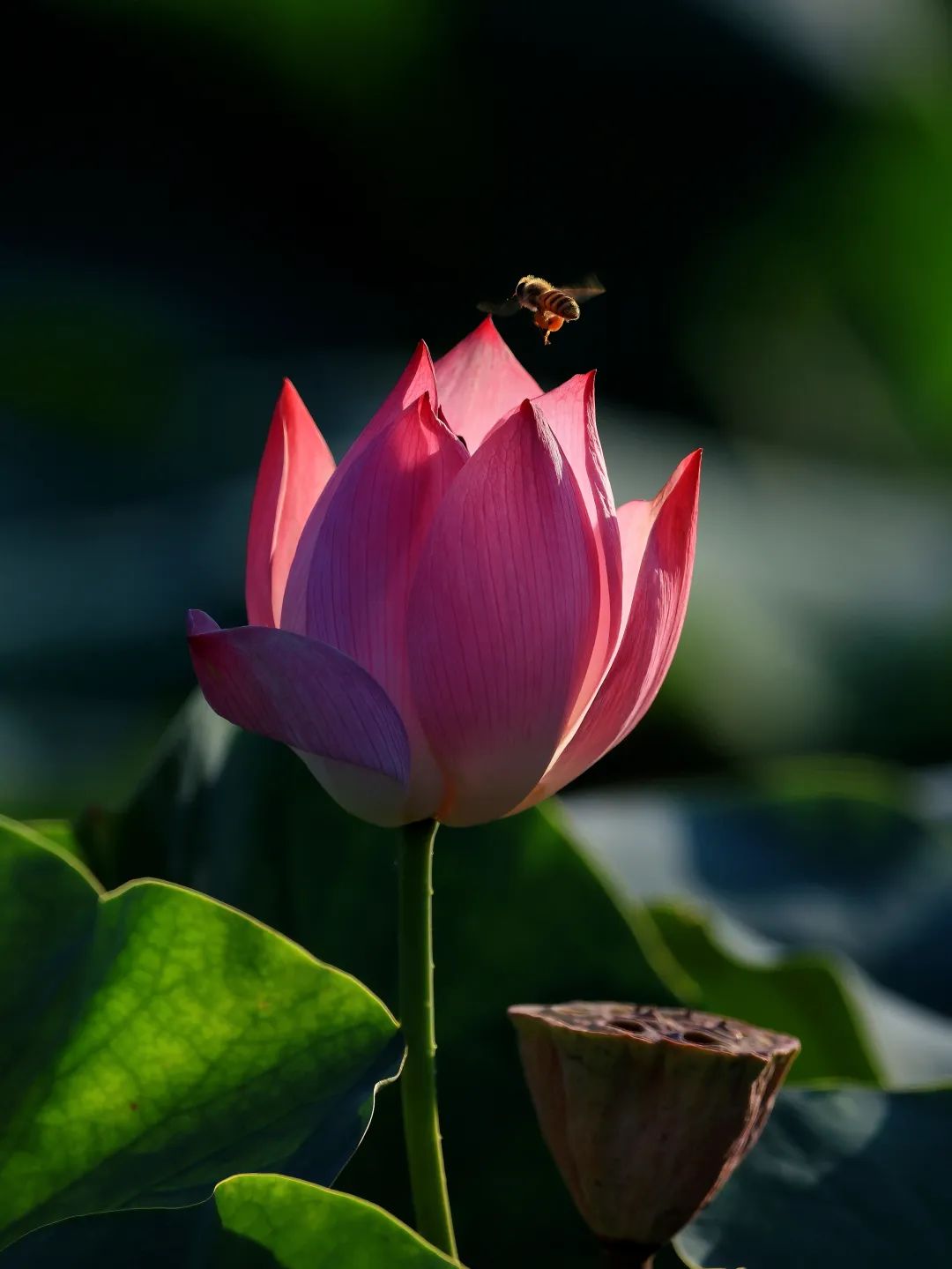 沙湖公园里,一只蜜蜂绕着荷花飞来飞去,久久不愿离去,它似乎在欣赏眼前的美景,也可能在诉说着对荷花的眷恋。年年岁岁花相似,岁岁年年人不同。美好的时光总是让人留恋。