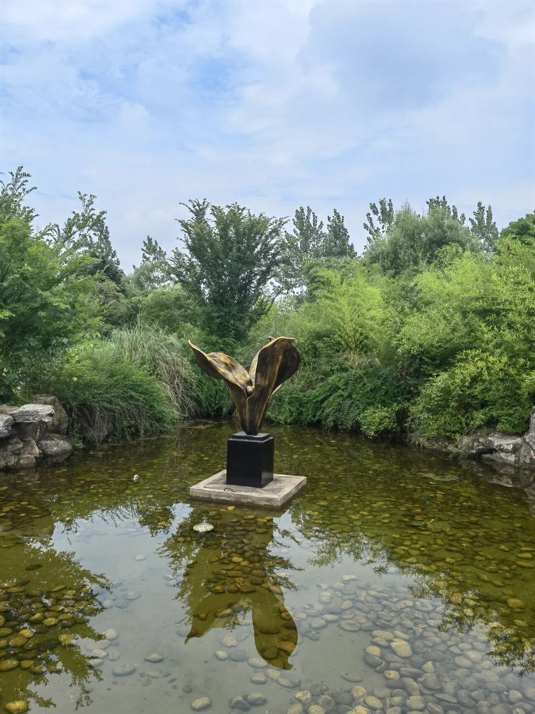 我来到一处水面旁,水上“绽放”的金属花朵“承诺”像一位优雅的舞者,吸引了我的目光。不锈钢打造的植物舒展着,寓意自然的复苏与重生。看着这生命力满满的雕塑,我不禁感叹大自然的神奇与艺术家的匠心。