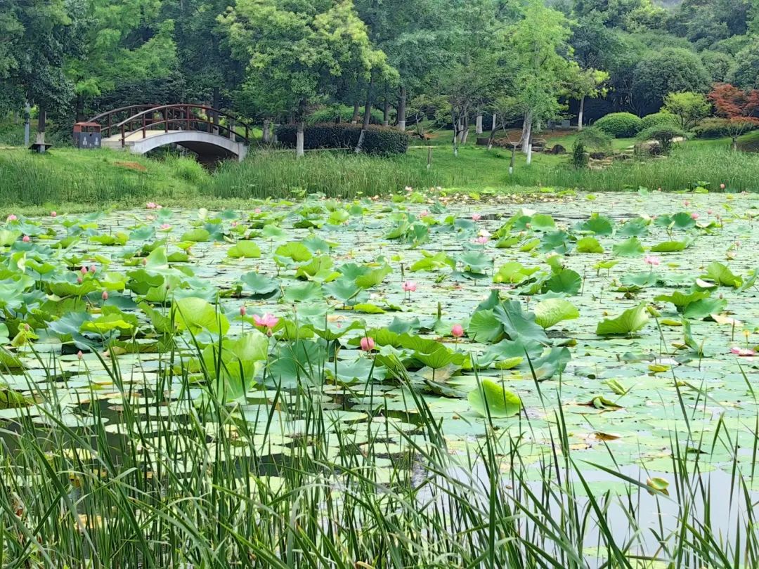 马鞍山森林公园湿地资源丰富,晓塘春色的水面,层层叠叠的荷叶上点缀着一朵朵娇艳欲滴的荷花,粉瓣轻垂,绿裙翻浪;东湖笛园处睡莲在湖面次第绽放;太渔桥周围是主要赏荷点,目前正处于含苞待放的状态。