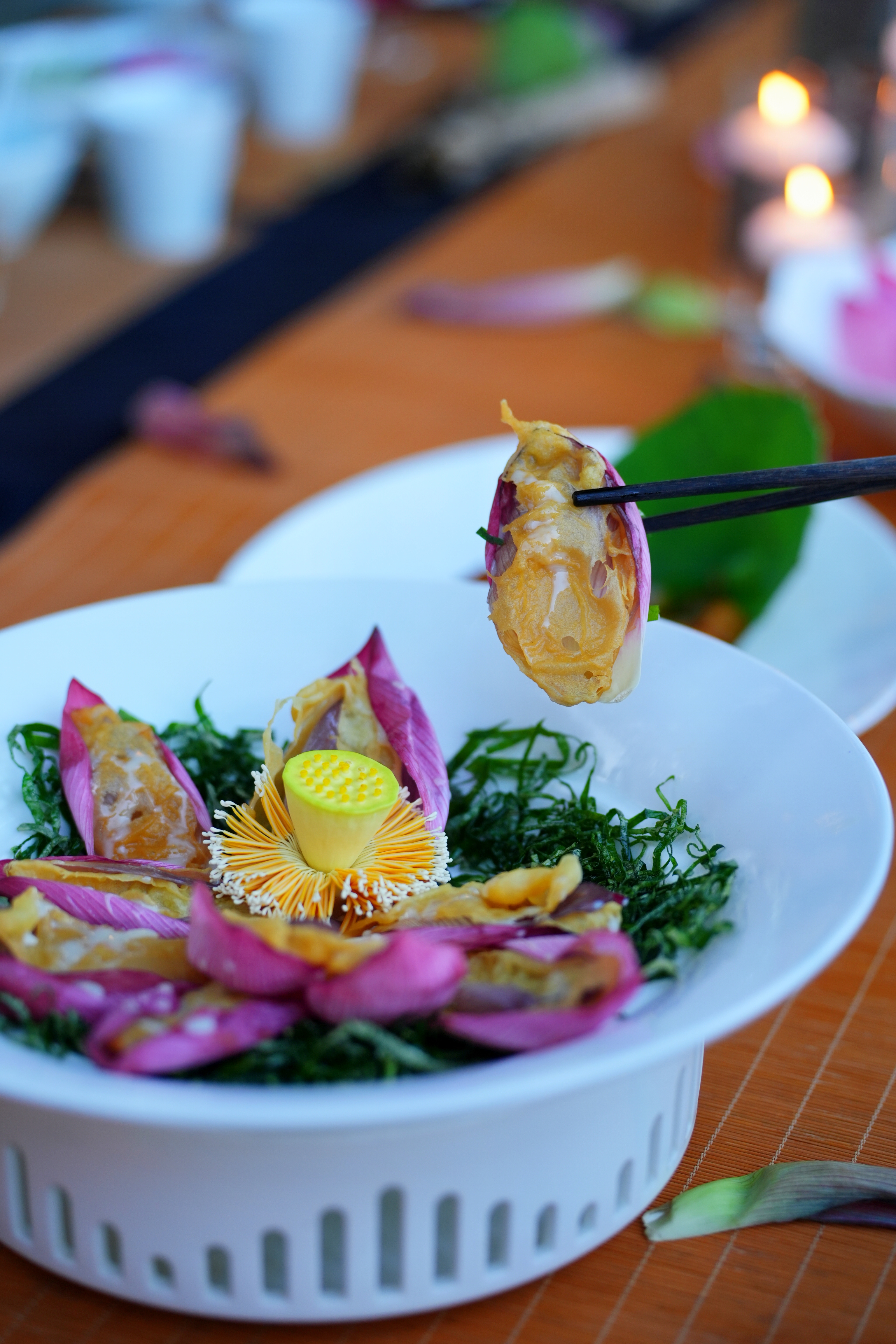 在现场可以看到,晚宴席位设于亲水露台,长长的木质餐桌上,配以青瓷餐具与荷花盆景点缀。沐手、焚香、品茶……宴席开场,各色菜式秀色可餐,餐厅以荷花、莲蓬、莲子为制作食材,将现代烹饪技术和传统荷花文化相结合,制作出一整套精美的荷花菜系。