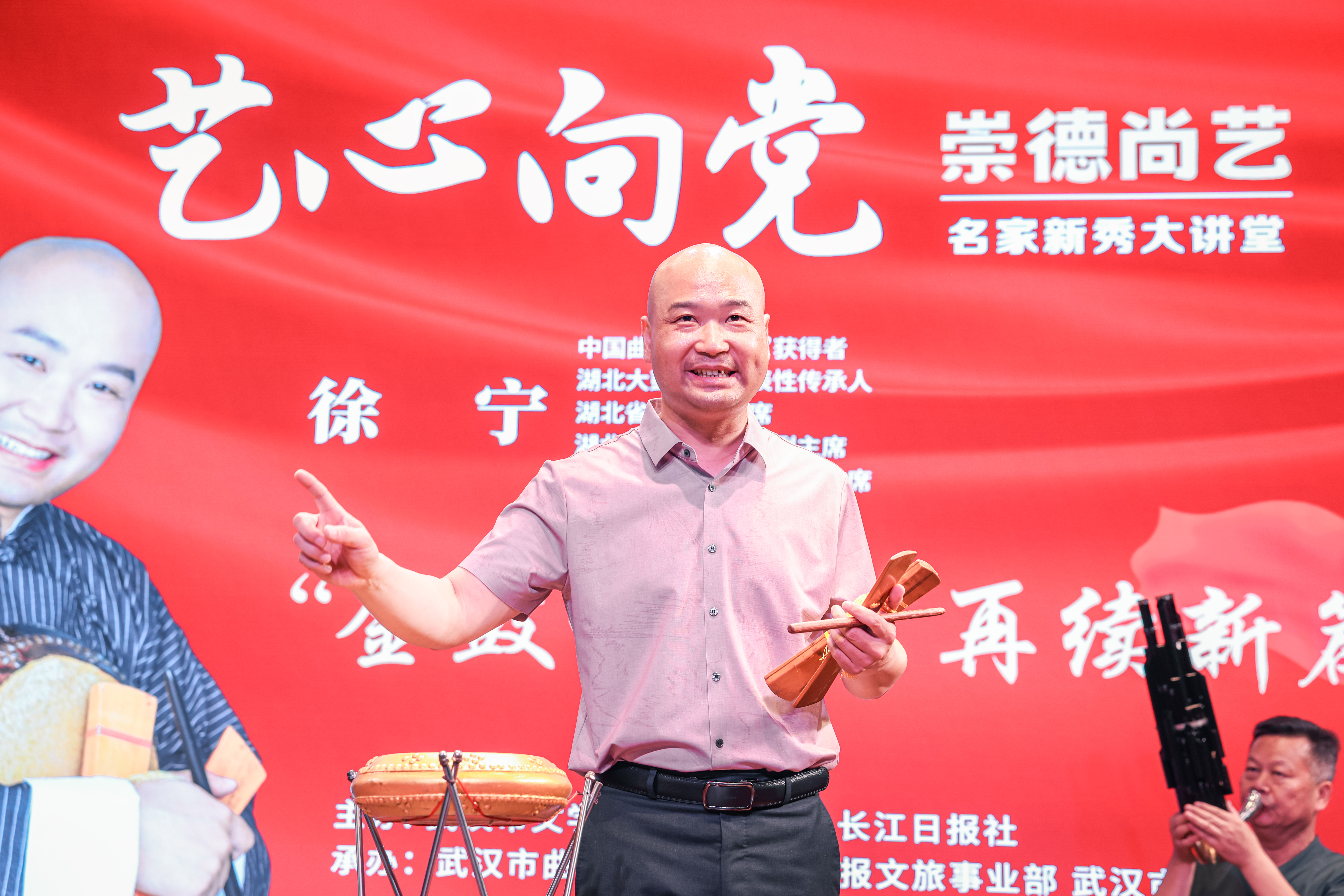鼓板铿锵,欢笑不断。6月17日下午,中国曲艺最高奖“牡丹奖”获得者、湖北大鼓非遗代表性传承人、武汉说唱团优秀青年演员徐宁做客“艺心向党崇德尚艺名家新秀大讲堂”,以“‘金鼓传奇’ 再续新篇”为主题,在武汉市艺术学校湖畔音乐厅和母校师生以及曲艺爱好者们分享近30年来的曲艺表演和创作心得。