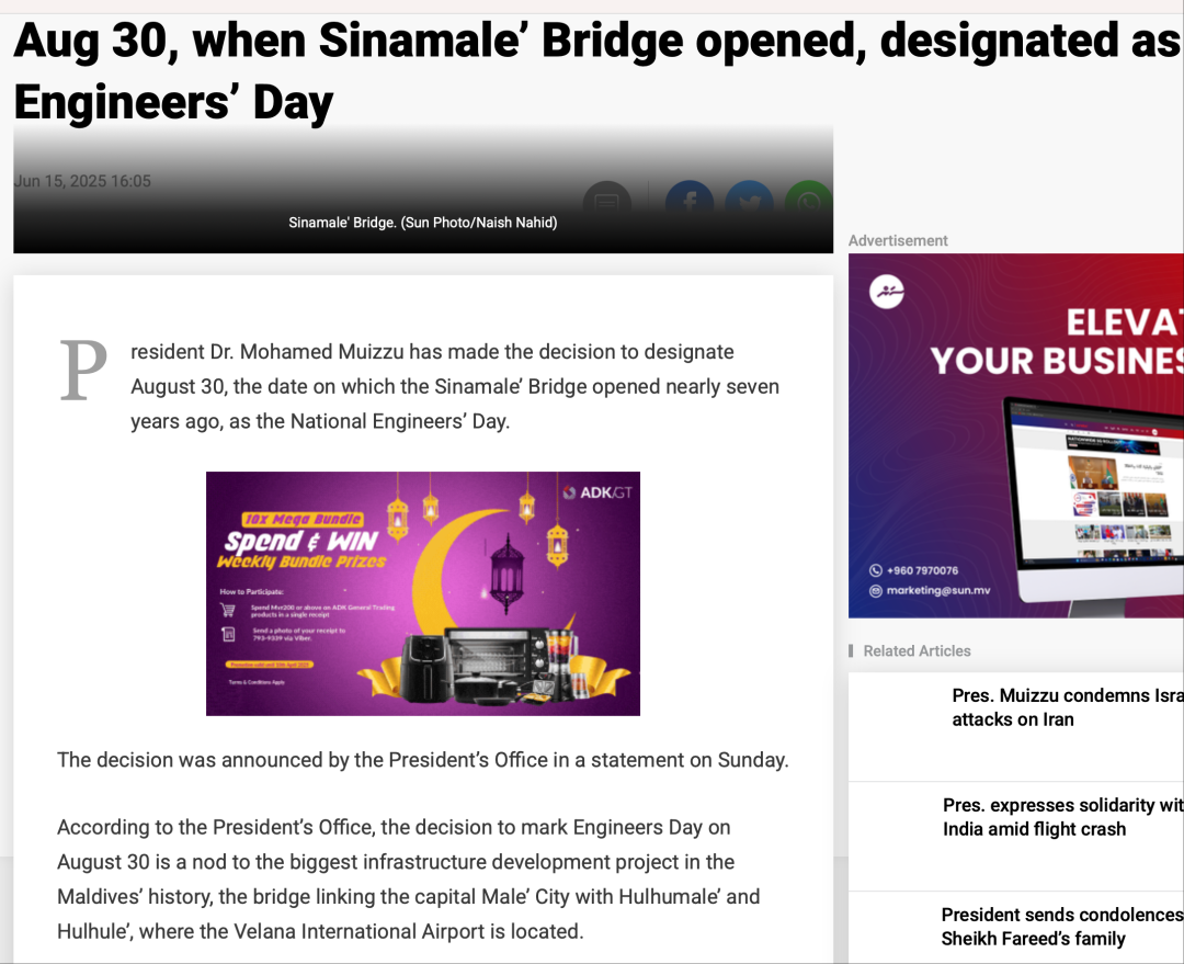 根据总统办公室声明,选择8月30日作为马尔代夫“国家工程师日”,旨在致敬马尔代夫史上最大的基础设施建设项目——连接首都马累市、胡鲁马累以及维拉纳国际机场所在岛屿的中马友谊大桥工程。总统办公室强调:“这是庆祝工程师日最合适的日期。”